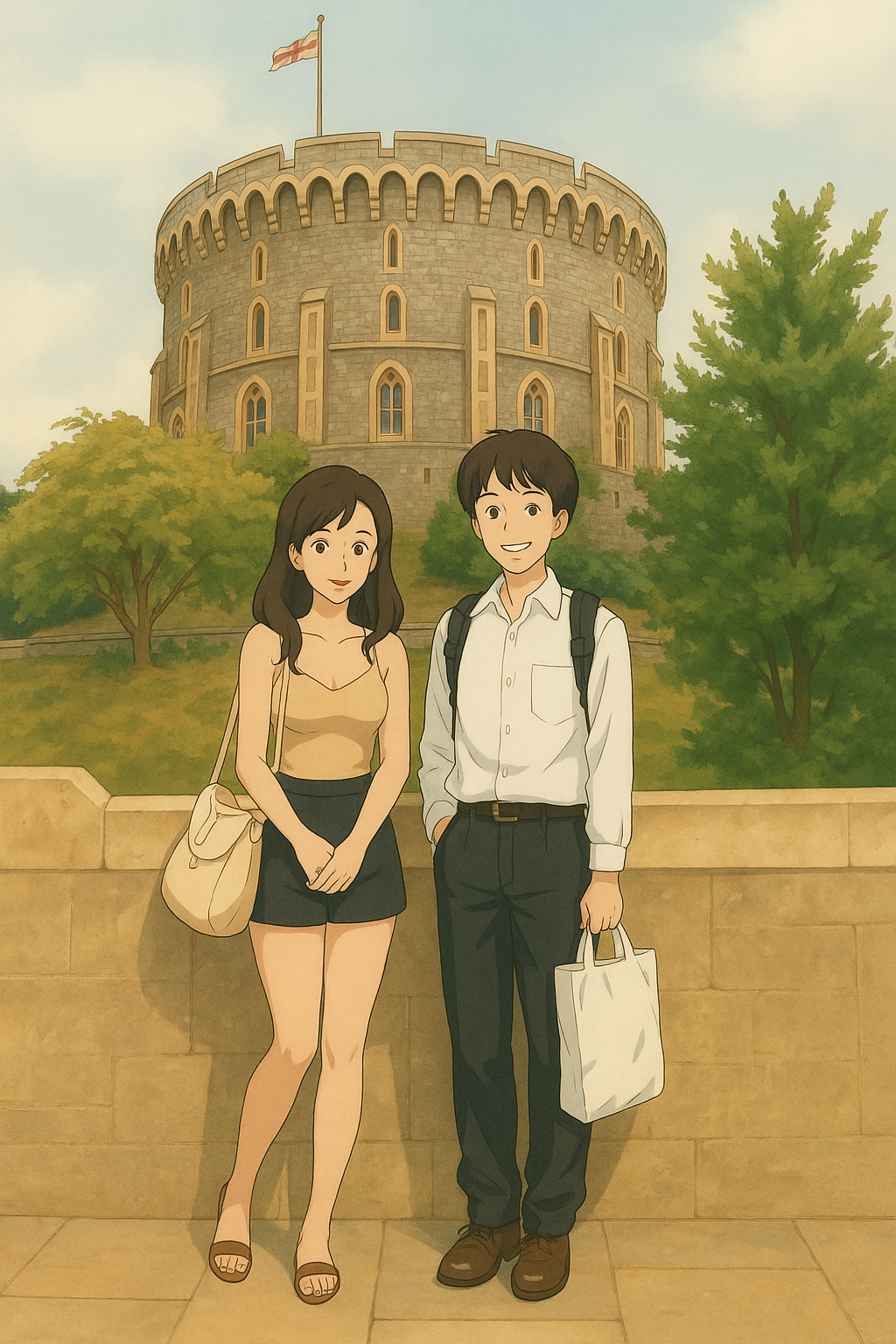 The soft colors and the overall serene atmosphere you've created are truly captivating. It’s amazing how you've managed to evoke such a strong sense of nostalgia and tranquility. I especially love the image of the couple at the castle tower. It's like something out of "Howl's Moving Castle"!