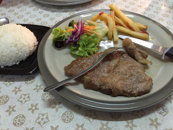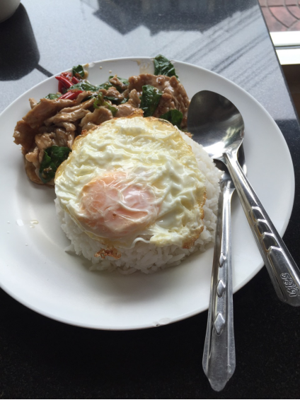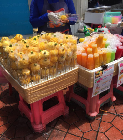 吃的呀,总的来说,我就是个吃货,什么都想吃;在这第一餐是在公寓附近的餐馆吃的一份炒饭,泰国这边感觉饭量都不大,对我来说只能堪堪塞点牙缝那!这是最困难的一点。然后有到各处去逛逛,会在街边吃各种小吃,住的附近就有一条街,什么都卖,小吃还有饭菜啊什么的,and唐人街的TK海鲜,考山路的泰式炒面(超级推荐!便宜好吃而且很中国的口味!)小菠萝很好吃,水果很多很新鲜!然后最近在公寓附近找到一家晚餐实惠而且肉多肉多肉多(重要的优点说三遍)的街边餐馆~计划着最近出去吃海鲜自助咯~在学校的时候有工作午餐,跟学生吃的一样,饭加菜,一天感觉总有一个很辣的菜,荤菜和素菜都有,有时候是面。然后学校还有很便宜的各种吃的卖,早饭也有(这边的荷包蛋都是蛋黄是液体的那种喔)。接下去看图。(拍照技术担待着看哈)