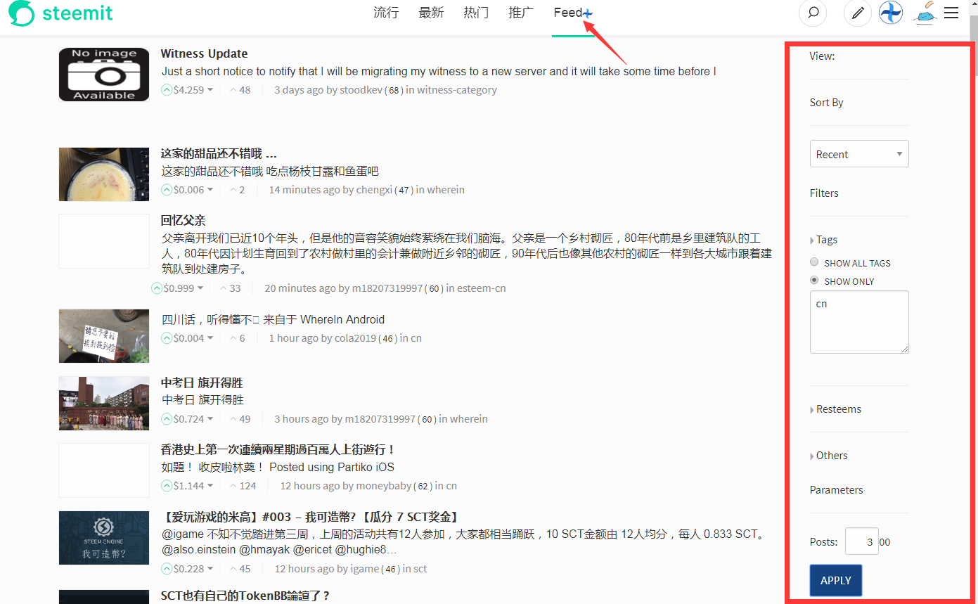 可以通过顶部Feed选项卡, 右侧筛选栏目提供了多功能筛选器, 可以通过比如 @cn-curation @wherein @cn-reader等标签筛选, 甚至可以根据声望筛选