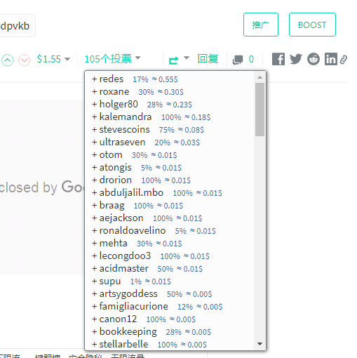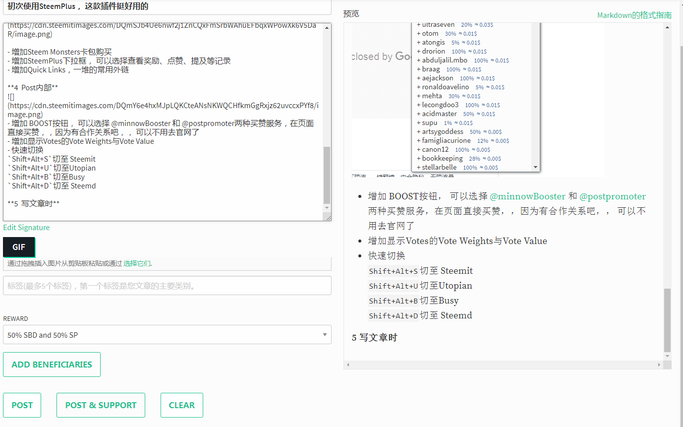 • 增加 BOOST按钮, 可以选择 @minnowBooster@postpromoter两种买赞服务,在页面直接买赞, 可以不用去官网了