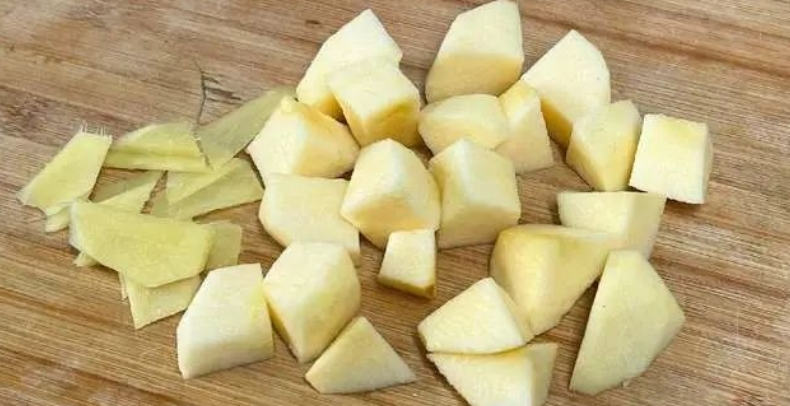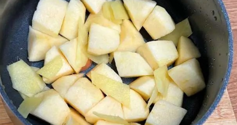 具体步骤:1、苹果放水龙头下冲湿,拿削皮刀嗖嗖几下搞定,然后切成小块。老姜冲洗完别用刀削,拿铁勺背逆着姜纹刮,像给土豆去皮那样唰唰两下,姜皮就全粘勺子上啦。怕辣的记得把姜切成硬币厚度的片,用刀背挨个拍松(像拍黄瓜那样),这样煮汤时辣味会变温柔~