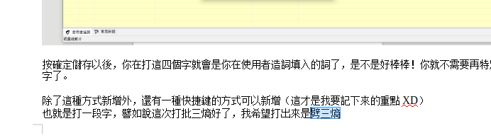 最近在拿聽打的資格,介紹個使用者造詞,主要是快捷鍵,因為其實真的不太會用到,臨時要用時還想了一下,這大概真的只有需要即時聽打的時候才會用到吧!?。