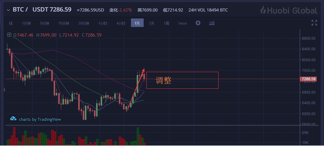 7.21 BTC技术分析iaw800801 (34)in #cn • 8 years ago 7月21日行情分析【BTC技术分析】火币网 BTC/USDT交易对图表作为参考 不构成任何购买参考,币圈大风险,盈亏自己承担。 周六BTC/USDT币价开7467.46最高7699最低7214.92涨幅-2.48% 大家看图,日线图 比特币会进行调整,时间和空间上的调整,不是一两天可以完成 调整第一个点位6850附近,等跌到再看形态 这一波的调整没那么的快的,别想着一两天调整完就开始涨,那是不可能的。 #btc