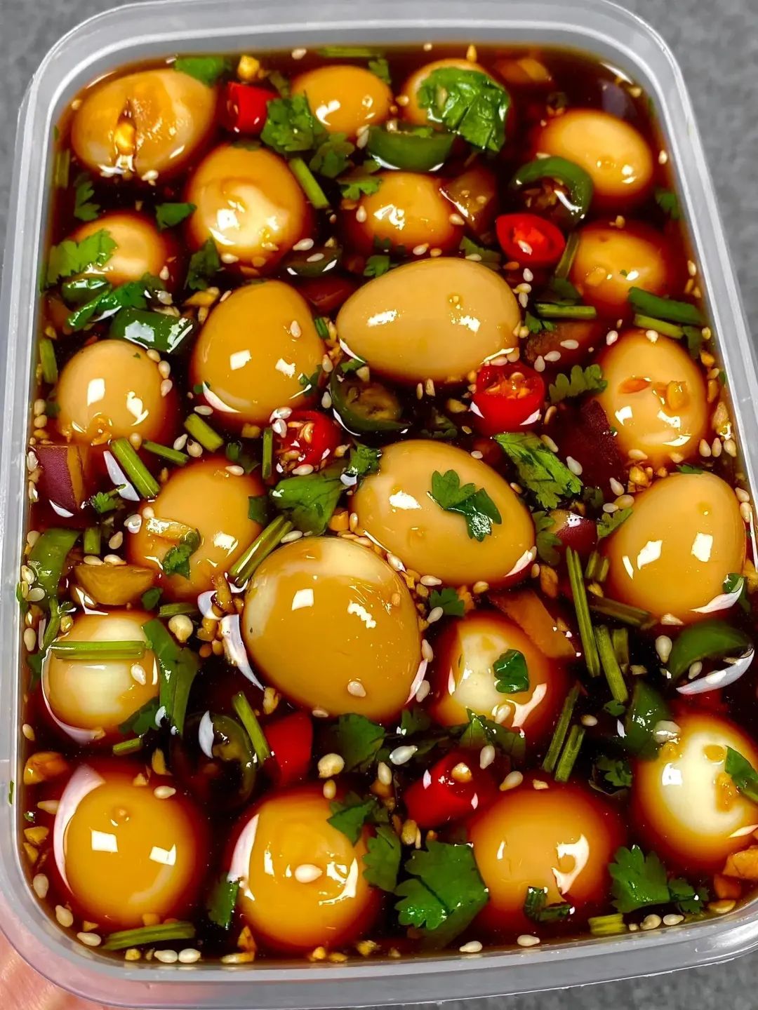 4、在容器里,放入鹌鹑蛋和已准备好的各种配料:洋葱,香菜,白芝麻,小米椒,青红辣椒,蒜沫。每一种配料都不可少,它们将给鹌鹑蛋带来独特的风味。