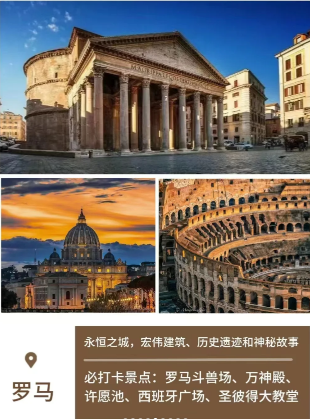 ✅必打卡景点:罗马斗兽场、万神殿、许愿池、西班牙广场、圣彼得大教堂。