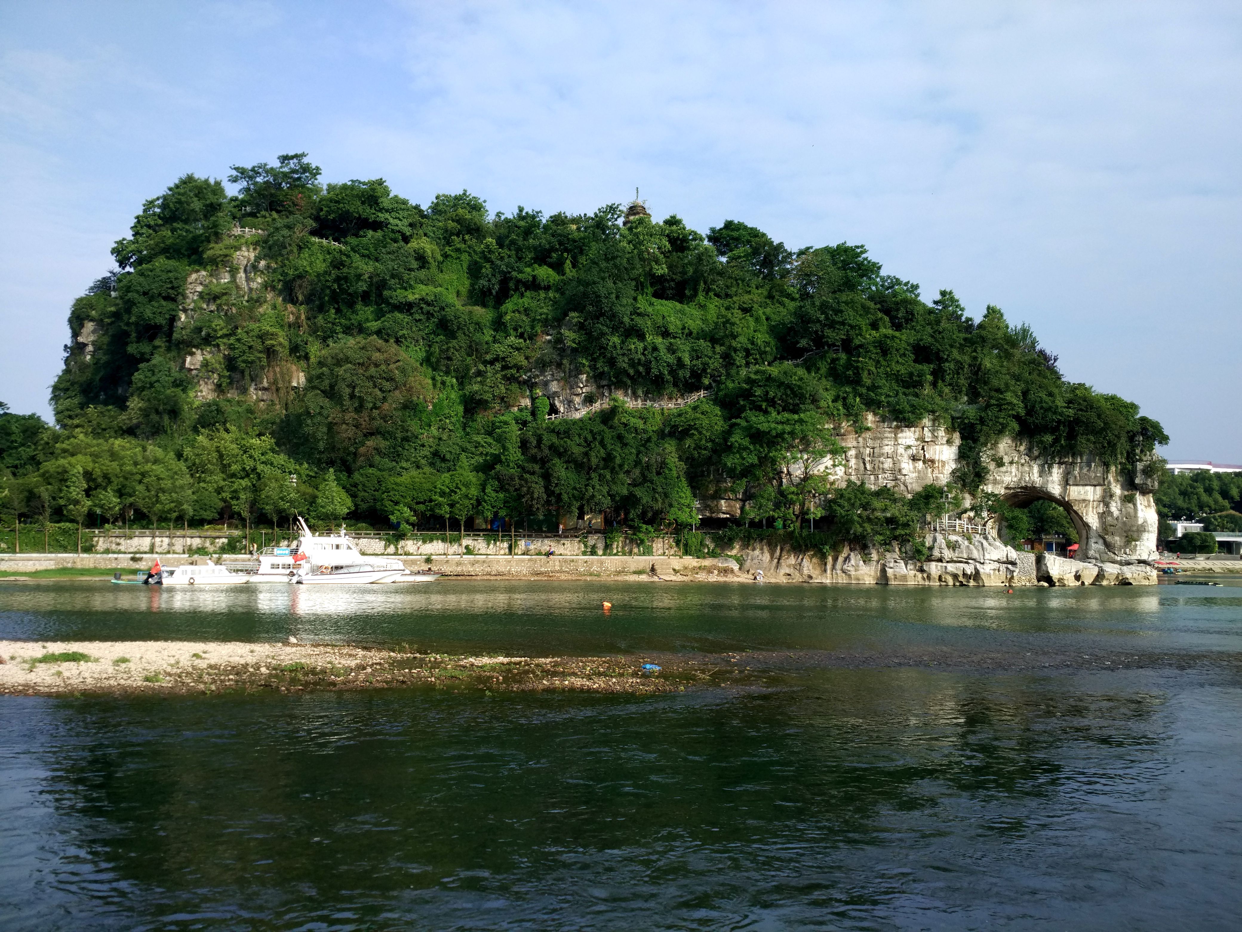 乘船游漓江,路过桂林城的标志——象鼻山,天然的地貌把青山雕琢的像是一头饮水的大象,长长的鼻子伸到江水之中,很形象。