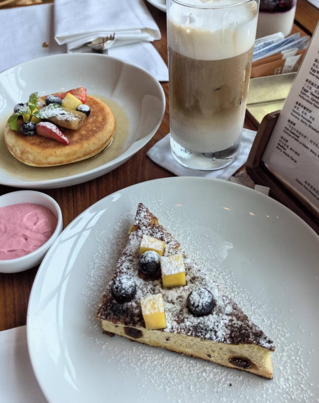 第二天一早直接在柏悦吃早餐。柏悦的早餐真的好吃!冰拿铁我的最爱,两杯打底!而且是半自助式的,菜单上的品我都想尝一遍,好吃!