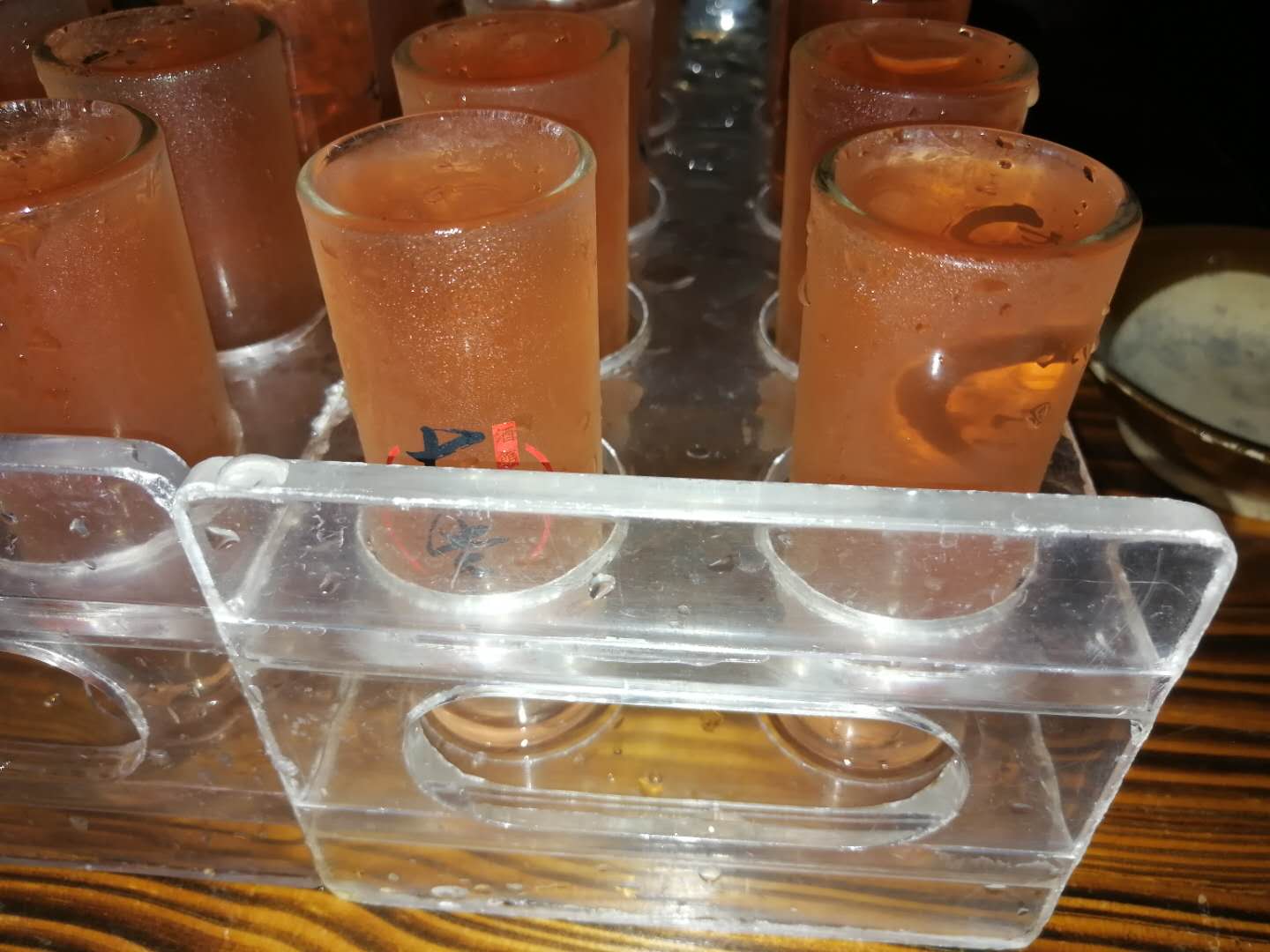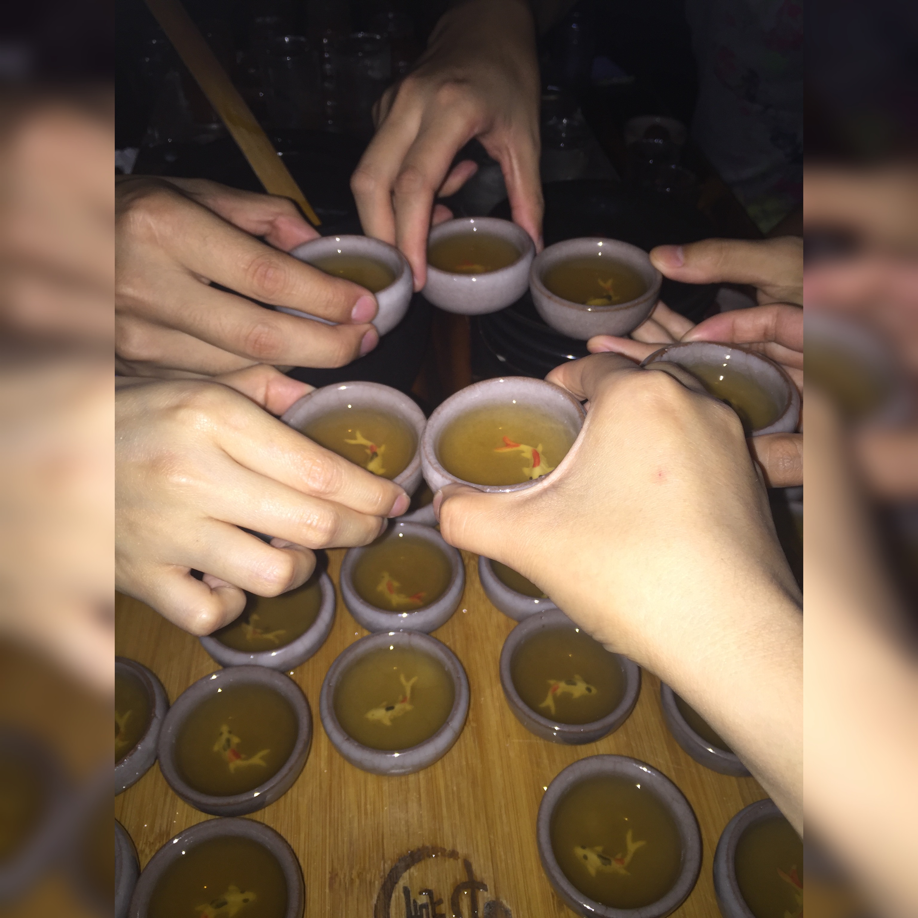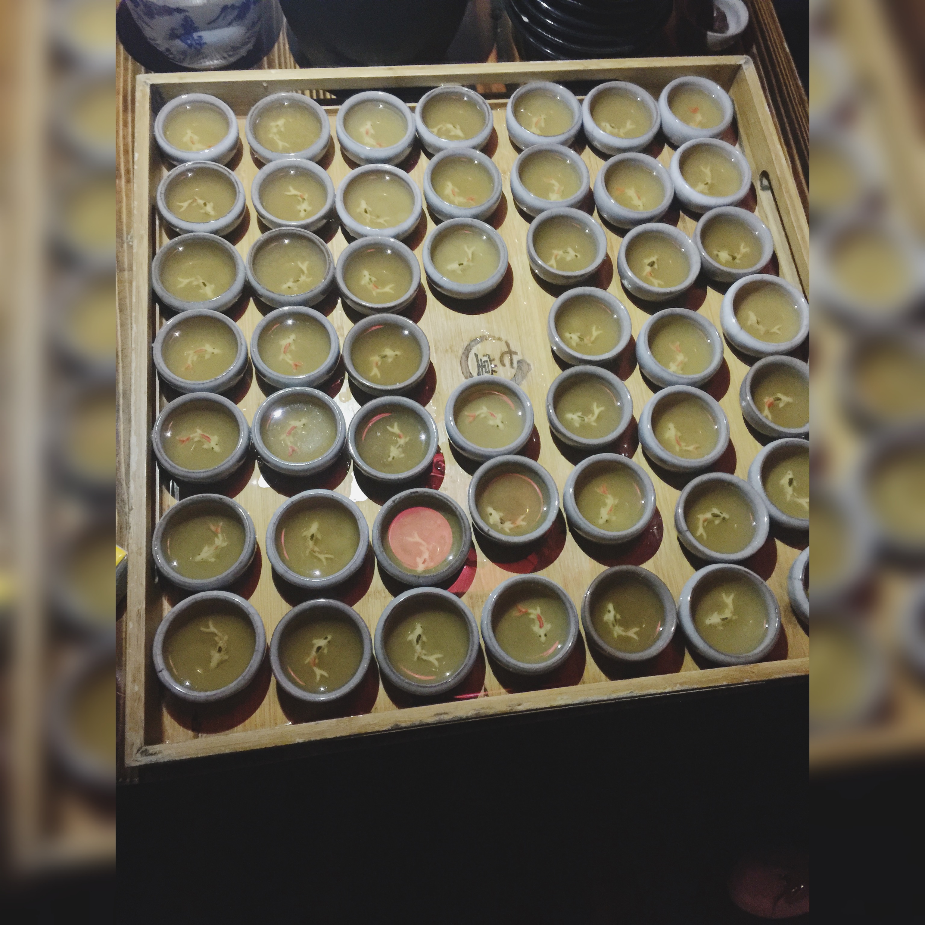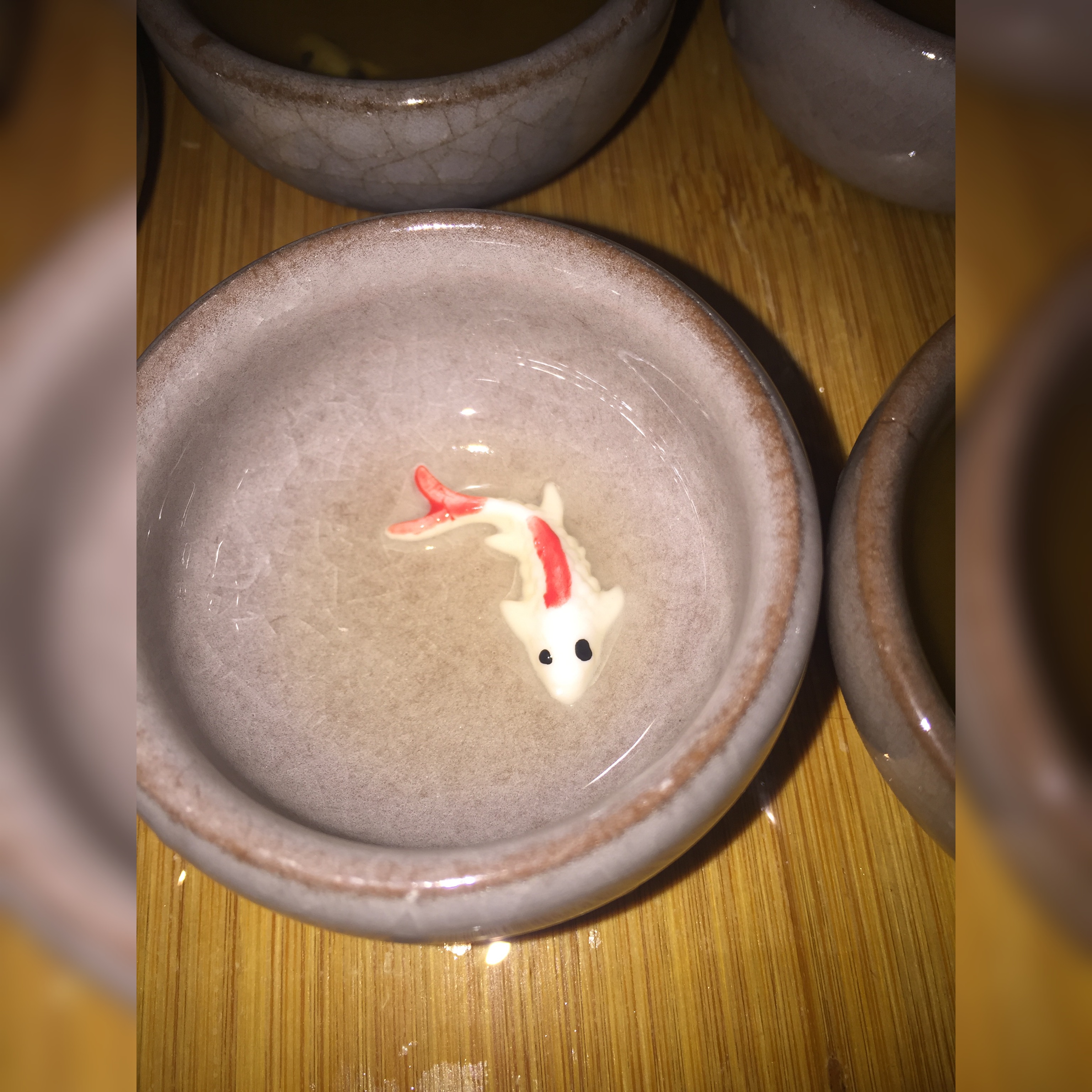 说完果酒,再说说他们店的白酒。要是以往这种纯白酒我是一点都不会尝试的。但是店员介绍这个白酒只有三十几度,入口很顺滑,完全没有不适的感觉。每个杯子里都有一只不同形态的金鱼,很可爱。