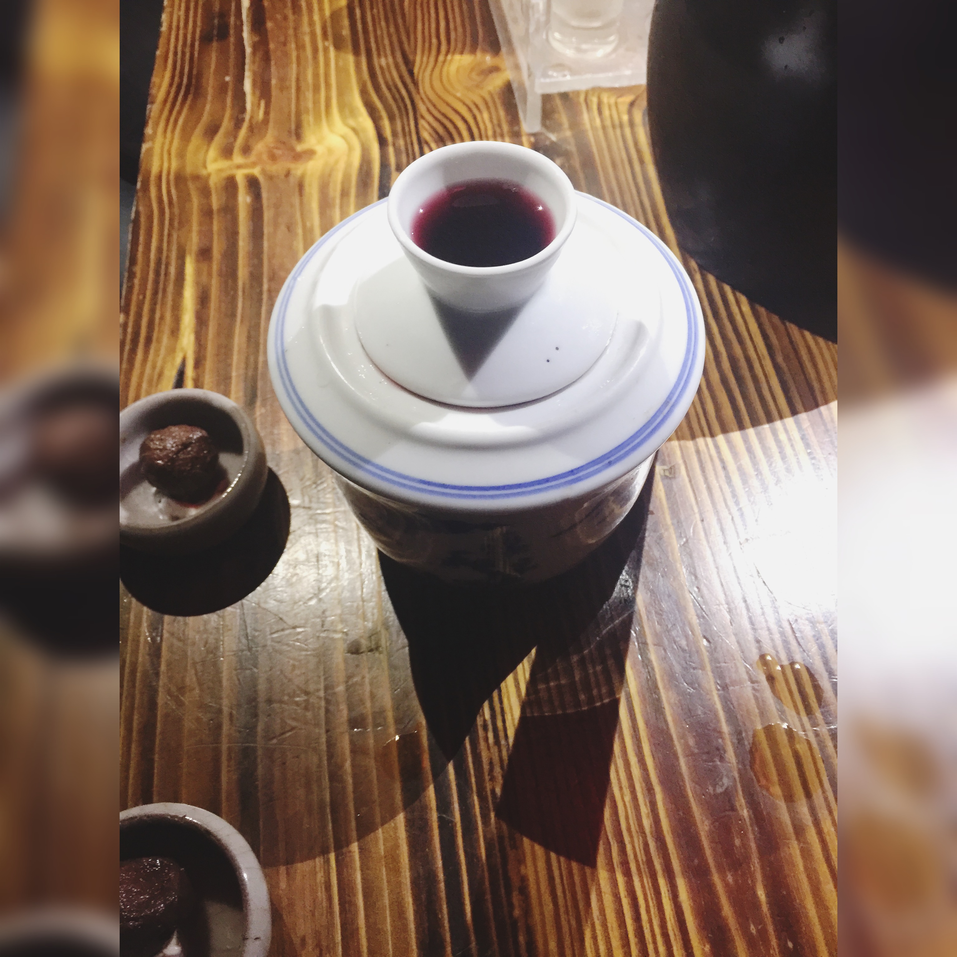 梅子酒,特别的是会在你的小酒杯里放一颗大梅子,酒壶下方放着冰,夏天喝着凉悠悠的,冬天会加上热水保温。
