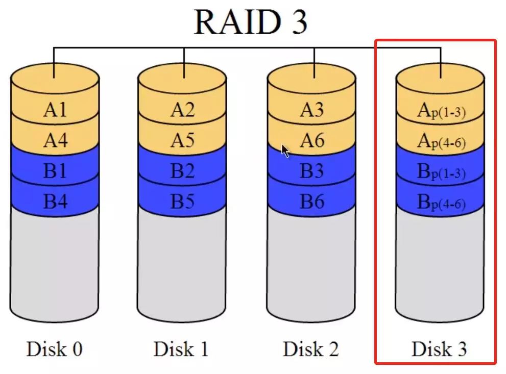 RAID 3 的原理就是,特意拿一块盘出来当作校验盘,把其他盘的数据拿出来做个 xor 操作,并且把结果存在校验盘中。