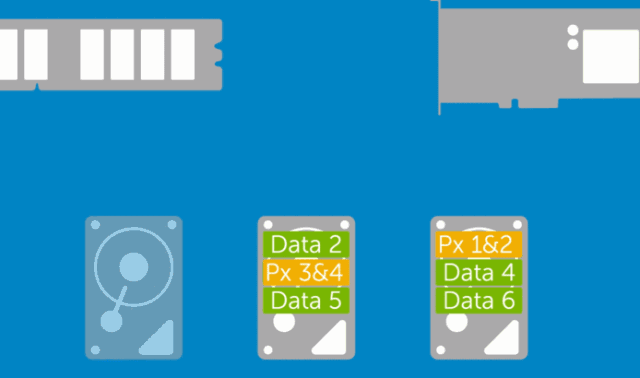 这个阵列需要至少 3 块硬盘,不过好处是,只要校验盘没坏,坏了一块数据盘可以反推恢复数据。