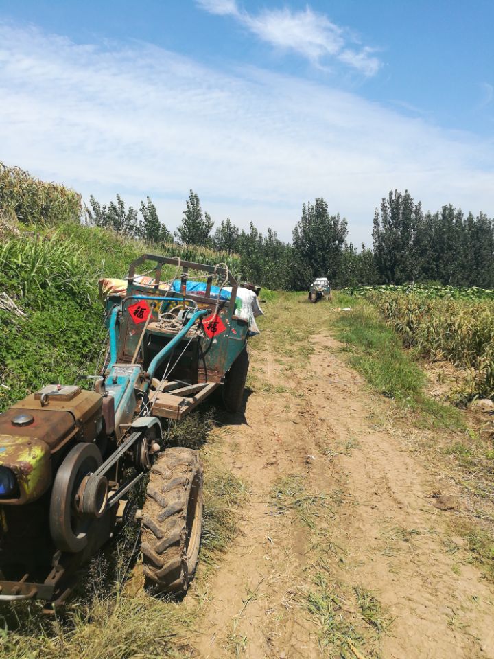 这是我们的运输工具,手扶拖拉机,现在农村其实也不太常见了,但是马力大,拉东西也很多,因为前段时间下雨,路上很泥泞,也就是这种手扶拖拉机可以自由行走了,但还是需要驾驶技术过硬啊,今天就有一辆三辆车因为拐弯的时候没掌握好方向,歪到路边的排水沟里去了~~