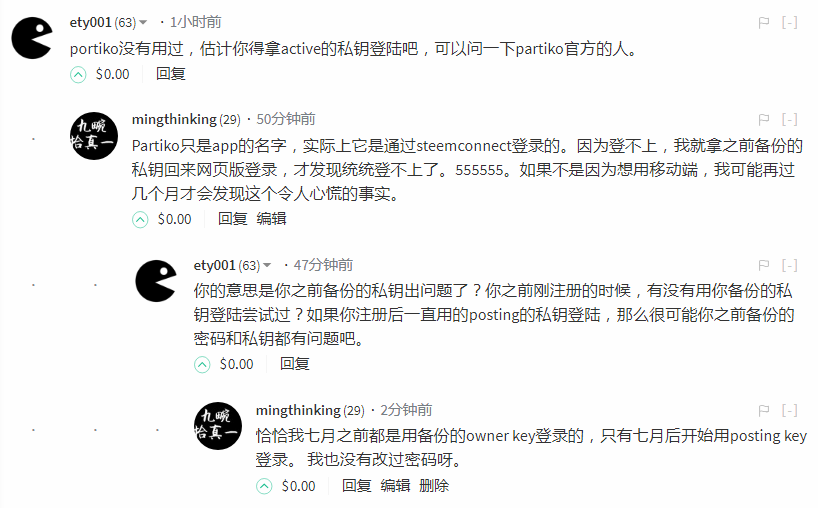 后来出于安全考虑,一直习惯只用posting私钥登录,昨天新下载Partiko要用active private key 登陆,可是试了若干次都显示incorrect password了。