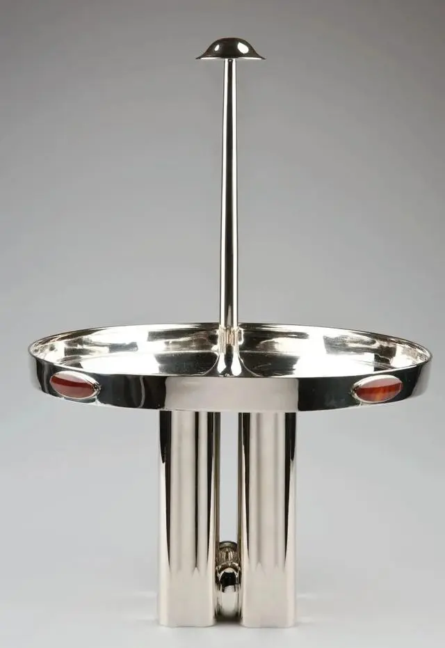 1903年,霍夫曼发起了一项雄心勃勃的事业,在银行家华恩多夫(Fritz Warndorfer)的资助下,他与科罗曼·莫塞尔(Koloman Moser, 1868-1918)一道创立了"维也纳生产同盟"(Wiener Werkstätte)。这个同盟是按照英国工艺美术运动的行会模式建立起来的,由霍夫曼与莫塞尔负责设计,生产家具、金属制品、珠宝和装饰品。霍夫曼视英国工艺美术运动为典范,他认为新风格的基本要素是可靠的材料、统一的装饰,以及与环境相适应的风格选择。因此,"维也纳生产同盟"制作的产品形式精练简洁,但使用的材料和手工艺又大都极尽豪华,与传统的装饰趣味相距甚远。其中,金属器皿的设计尤为出色,虽是手工制作,但其造型和表面处理好像在模仿机制品,与19世纪机器产品模仿手工制品的趣味截然不同——预示着机器美学时代的到来。