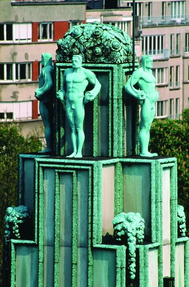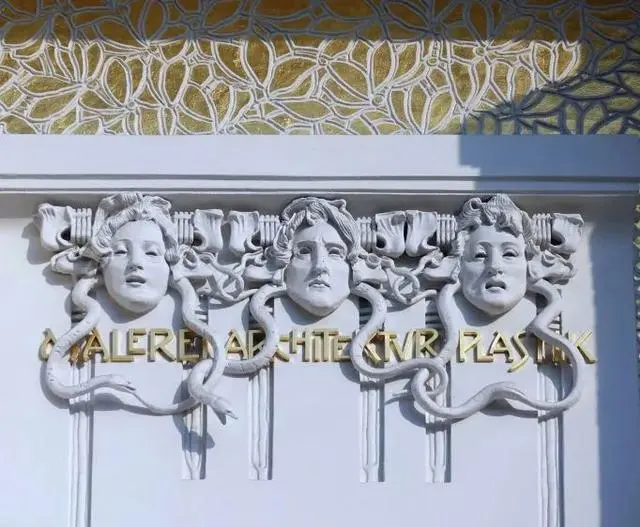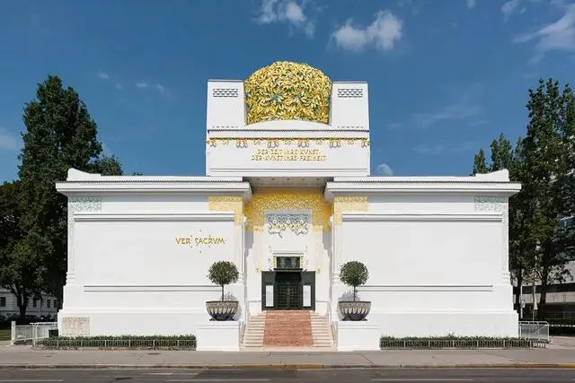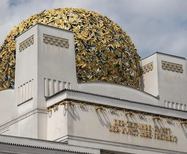粉刷成白色的几何形体块装饰着少量风格化的象征主义装饰,盘绕的镀金铜叶饰串联成穹顶——这座如今闻名遐迩的新艺术建筑,如同分离派艺术家一样,摆出一副自信的反抗姿态,与附近19世纪中期浮夸的历史主义风格建筑卡尔广场或环城大道上的大型文化机构建筑,形成鲜明对照。