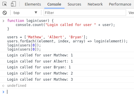 使用console.count()来计算相同标签传递给函数的次数。 此方法会逐行显示出触发次数。 使用该方法的可选参数可以打印出一串包含次数的消息。