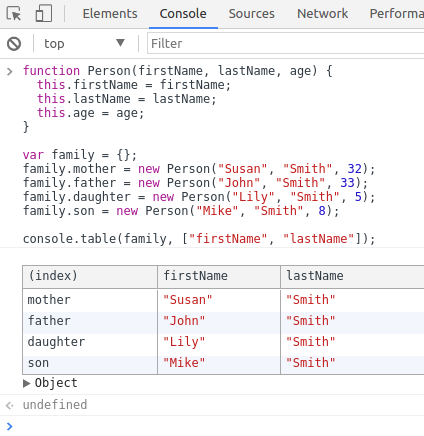 table()的第二个参数可以被用来记录更高级的对象和特殊的属性。 例如,仅打印出所需的属性值。