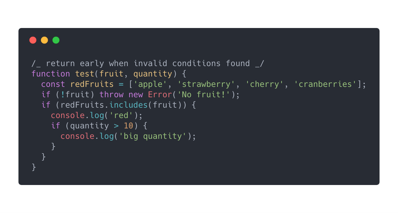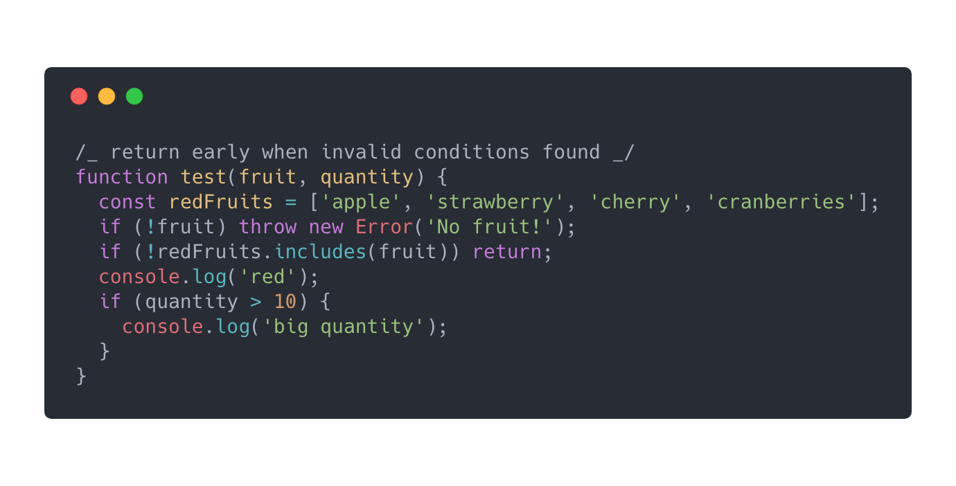 通过把条件单独提取出来,我们的代码现在在从嵌套中解脱了。当我们有很长的逻辑需要去执行并且当条件不满足时我们想要停止下面的代码运行的时候这个方法是很有用的。