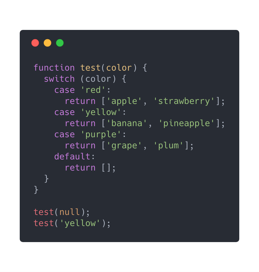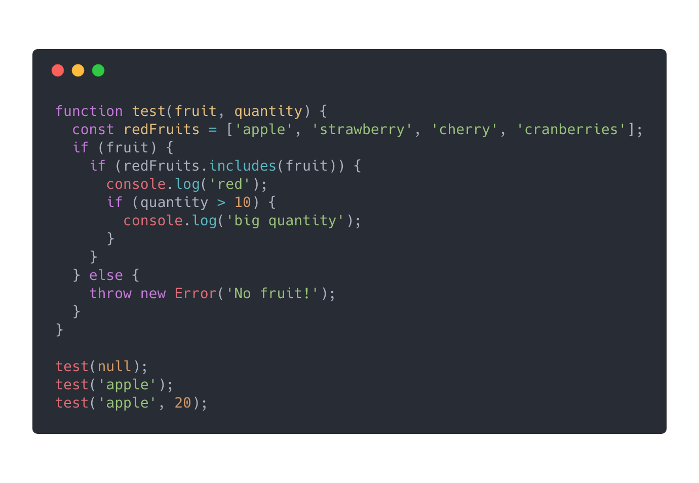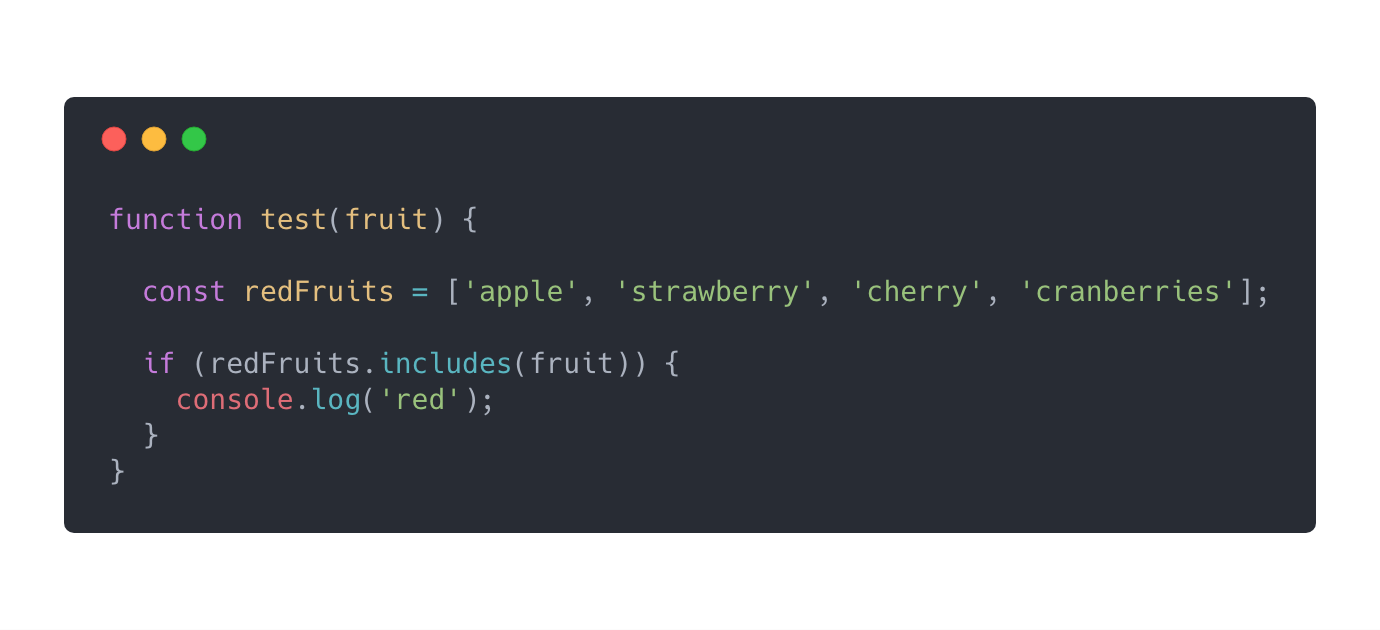 第一眼看下来,上述代码看起来是不错的。但是,如果我们需要加入更多红色水果,比如cherry和cranberries呢?我们是否应该继续用“||”去扩展这个条件表达式呢?我们可以用Array.prototype.includes重写上述的条件语句。