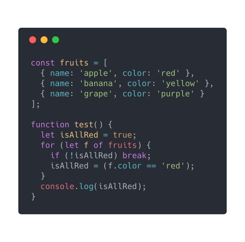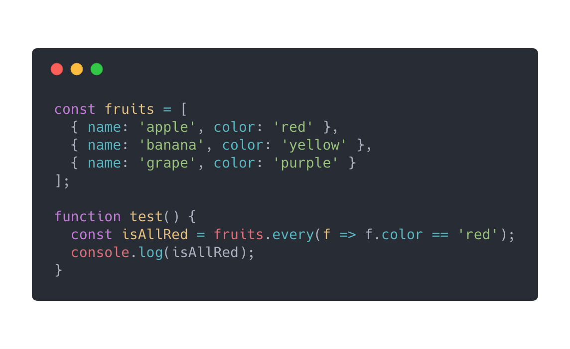 最后一个技巧更多的是去利用新的(但并不是最新的)JavaScript数组方法来简化代码。看看下面的代码,我们要检查是否所有的水果都是红色的: