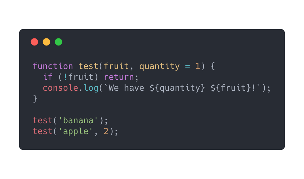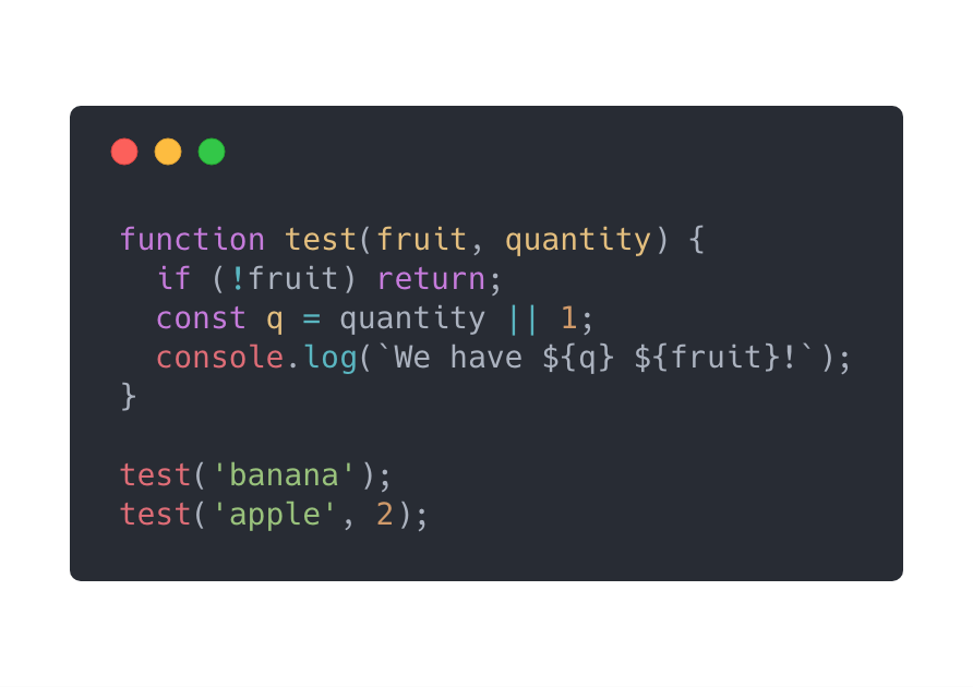 是不是更简单明了?童鞋们赶紧记下来 default function parameter。同样的,我们也可以这样 function test(fruit = 'unknown', quantity = 1) 给fruit设一个默认值。那如果fruit是一个对象呢?我们还能赋默认值吗?
