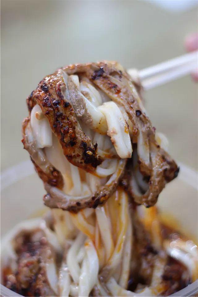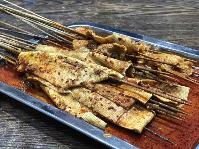 除了炒米,他们家的涮牛肚和涮豆皮也是每桌必点,只能按大小中份来点,牛肚和豆皮就是麻酱和红辣椒油浸泡出来的,入口过分软绵,如果有喜欢软货,可以来几串。