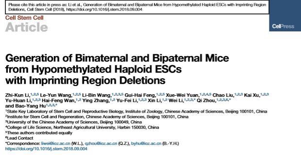 10月11日,国际学术期刊《细胞干细胞》(Cell stem cell)发表了中国科学院动物研究所的成果,科研人员通过对单倍体胚胎干细胞进行印记基因修饰并利用该细胞进行复杂胚胎操作的形式,得到了世界上首只双父亲来源的小鼠,以及性状正常的双母亲小鼠。According to the Australian daily mail of October 11, Australian fertility expert Dr David Molloy, Dr (David Molloy) predicted a breakthrough in reproductive technology, with two women soon able to have babies belonging to each other (without the involvement of men). His prediction is based on a successful experiment by the Chinese Academy of Sciences in which two female mice successfully gave birth to mice. On Oct. 11, (Cell stem cell), an international academic journal, published the results of the Institute of Zoology of the Chinese Academy of Sciences. By imprinting haploid embryonic stem cells and using them to perform complex embryonic manipulation, the researchers produced the world's first double-fathered mouse and a normal twin-mother mouse.
