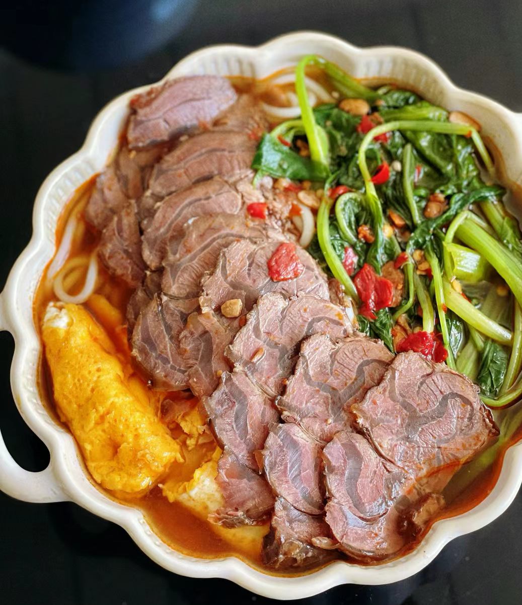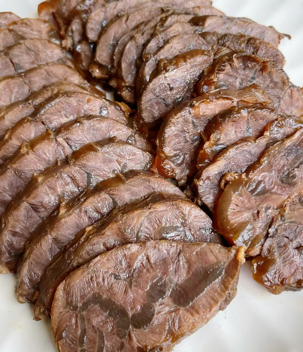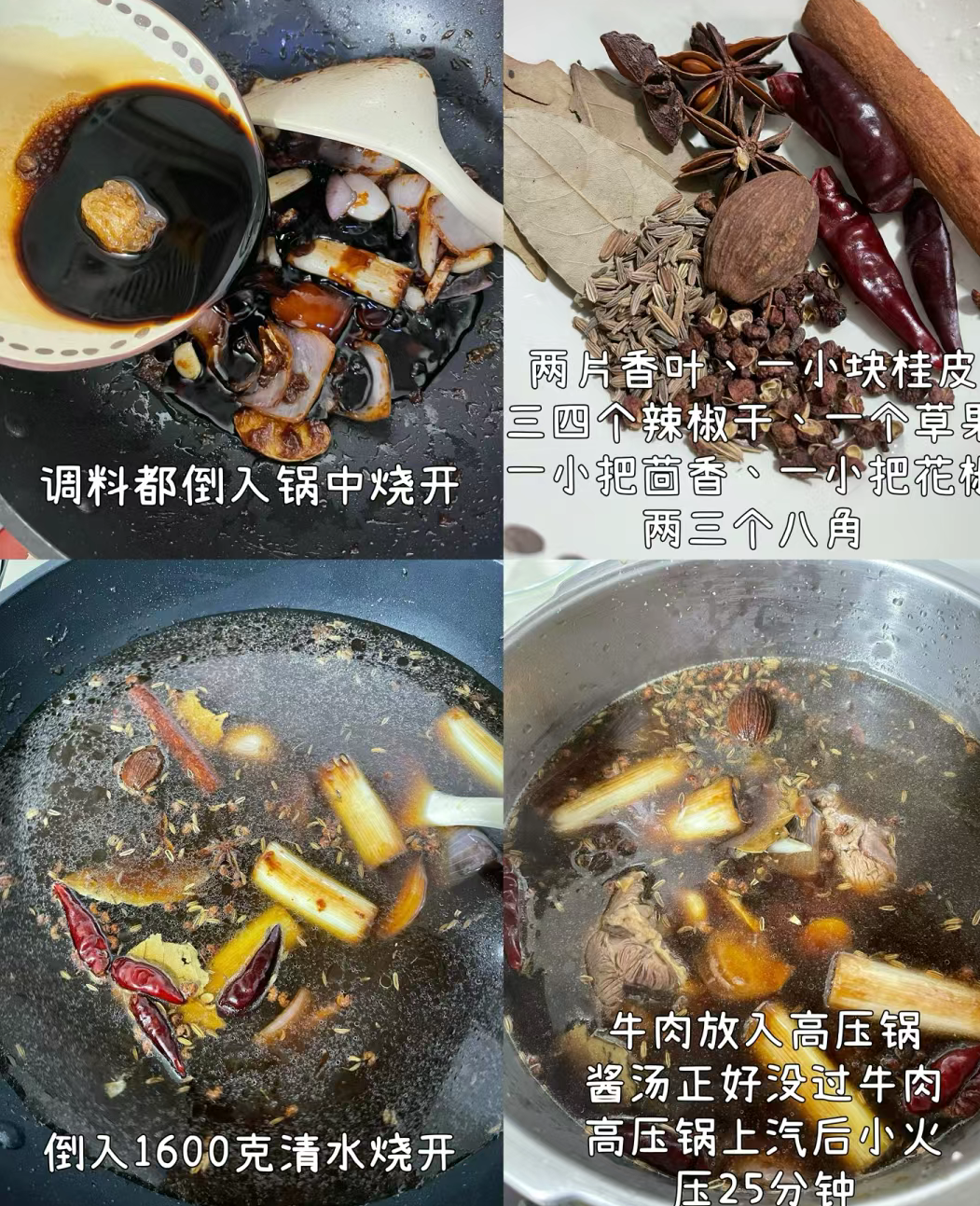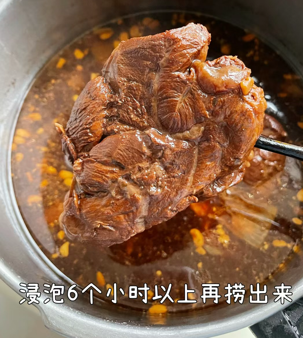 8.牛肉放进高压锅,将酱汤倒进去,酱汤正好没过牛 肉。高压锅上汽以后,开小火压25分钟,关火后不开 盖再浸泡6个小时以上,能隔夜更好。