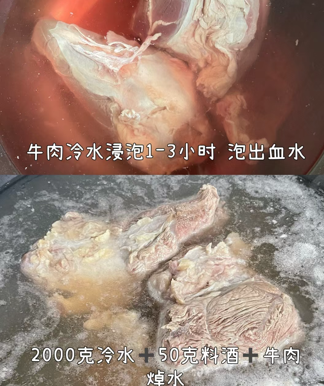 1.1000克牛肉冷水浸泡2-3小时,期间换水2-3次