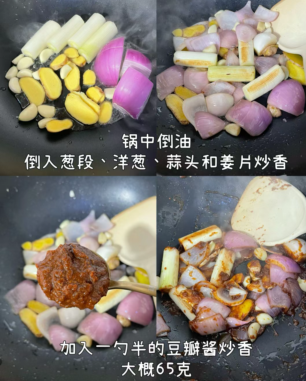 3.锅中倒油,加入80克葱段,120克洋葱,30克蒜头和 30克姜片,炒香