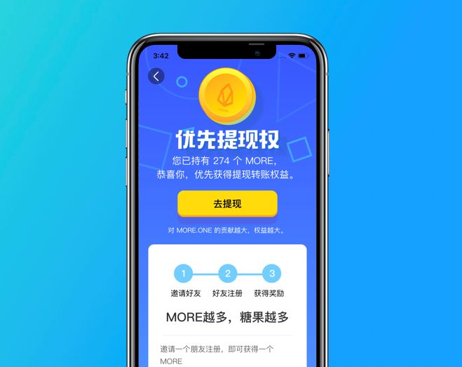 MORE总量仅1000万,是MORE.ONE糖果盒子的权益凭证,拥有数量越多,可优先获得提现、限量糖果、糖果增值等福利。