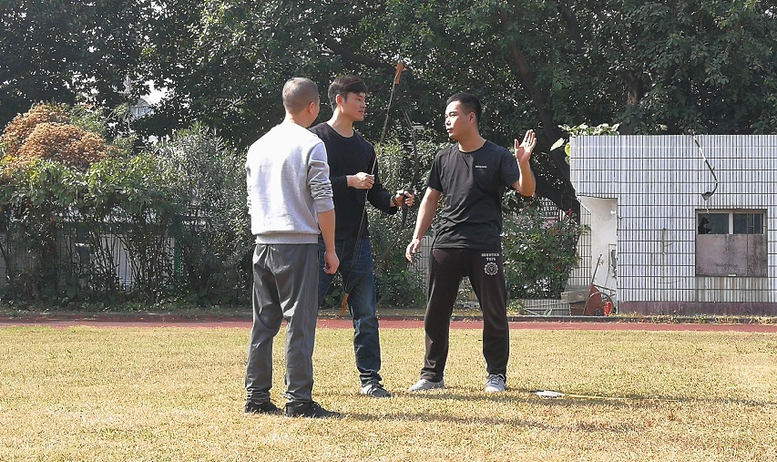 旁边黄伟锋和周高华还在用包住海绵的木剑练习,张斌在一旁观看。