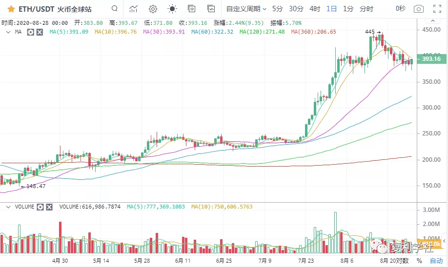 ETH:走势联动比特币为主,底部逐步形成,后市可以持有适当仓位,第一支撑位388,第二支撑位370,第一压力位398,第二压力位408,建议388以上继续持币,跌破减仓部分回踩370附近企稳接回。