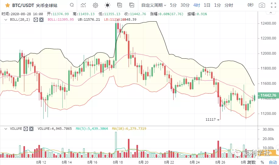 BTC:4小时级别看,币价再度突破布林线中轨,行情有了企稳的迹象。