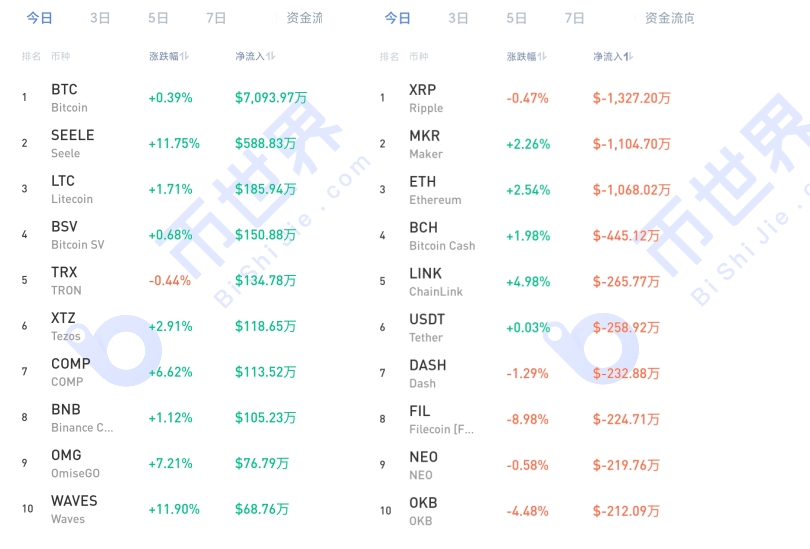 截止至今日晚间6时,加密市场资金流入趋势已现疲态,但总体仍保持流入态势。在资金流入榜上,BTC净流入超7000万美元。其他大市值币种包括LTC、BSV、TRX等,但流入金额相对较小。在资金流出榜上,XRP流出超1300万美元,暂居榜首。昨日资金大幅流入的ETH和BCH则分别出现了超1000万美元的流出。
