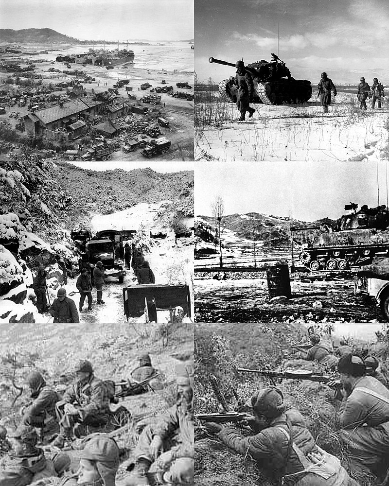 朝鲜战争是朝鲜半岛上的朝鲜民主主义人民共和国(朝鲜)与大韩民国(韩国)之间的战争,中华人民共和国、苏联出兵支持朝鲜,而16国组成的联合国军(主要为美国)出兵支持韩国。在三八线发生冲突及南部发生四三事件等事态后,朝鲜人民军于1950年6月25日跨越三八线南下入侵韩国,战争开始[54][55][56],联合国军与中国人民志愿军先后参战,最终于1953年7月27日在板门店签署《朝鲜停战协定》,根据停战时实际控制线建立朝韩非军事区作为缓冲地带。朝鲜半岛南北双方仍有外交冲突和军事对峙,持续至今。