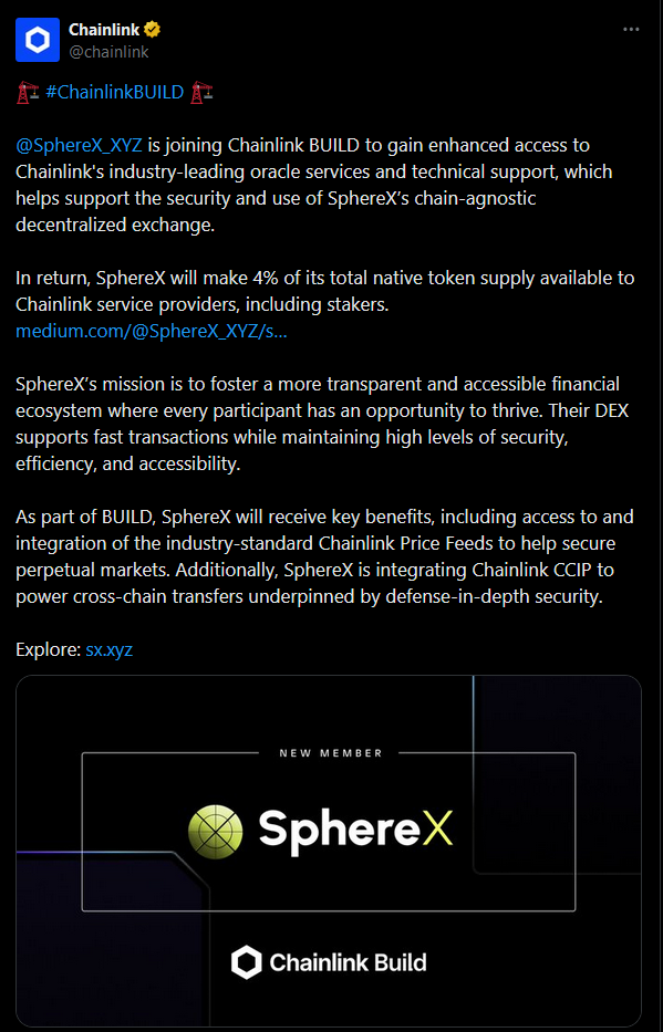 另一方面,SphereX加入了 #chainlink 的BUILD 计划,成为Chainlink生态的一员。SphereX作为永续合约DEX,需要使用预言机计算获取原始资产的价格。Chainlink技术与生态联盟有利于SphereX构建一个更透明、更健康的永续合约交易生态。