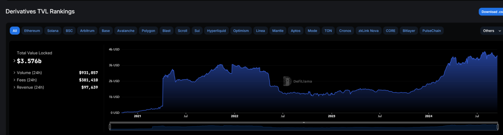 然而,Defillama的数据显示,衍生品类的TVL,在2024年7月底达到历史新高(38.5亿美元),是2021年最高点的1.25倍(30.74亿美元)。