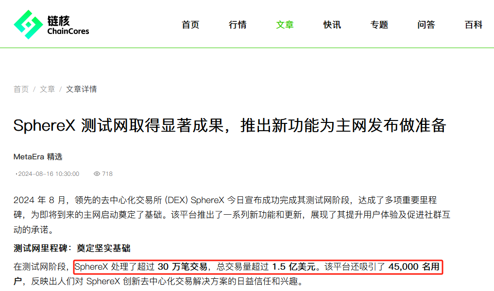 在Blast测试阶段,很多用户参与了SphereX的测试网。根据媒体报道,在测试网阶段,”SphereX 处理了超过30万笔交易,总交易量超过1.5亿美元。该平台还吸引了45,000名用户。”