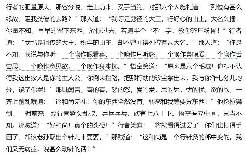 另外,《西游记》原著里,孙悟空拜唐僧为师后,遇到过6个强盗,名字就是根据这六根起的。