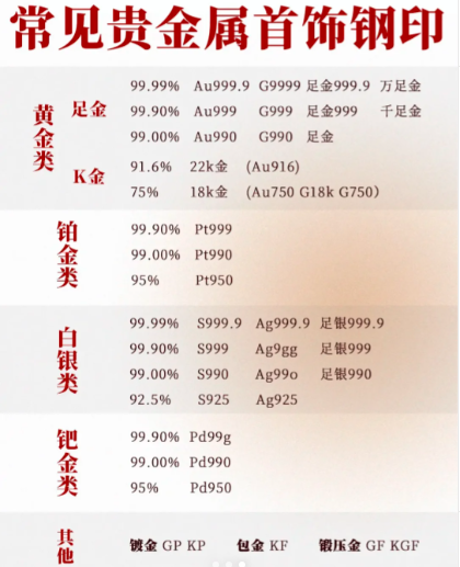 足金(含量99.99%)都在此列。除了“足金”标识之外,还有“ Au990”、“G990” 、“GOLD9999”等