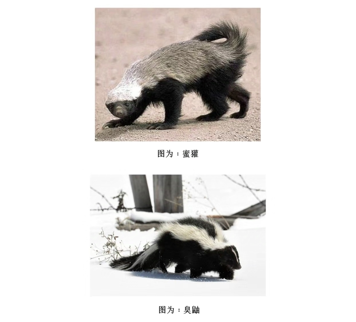 例如,蜜獾和臭鼬。这些动物具有强大的自然防御能力,不需躲避和隐藏,醒目的颜色是它们警告其它动物远离的方法。