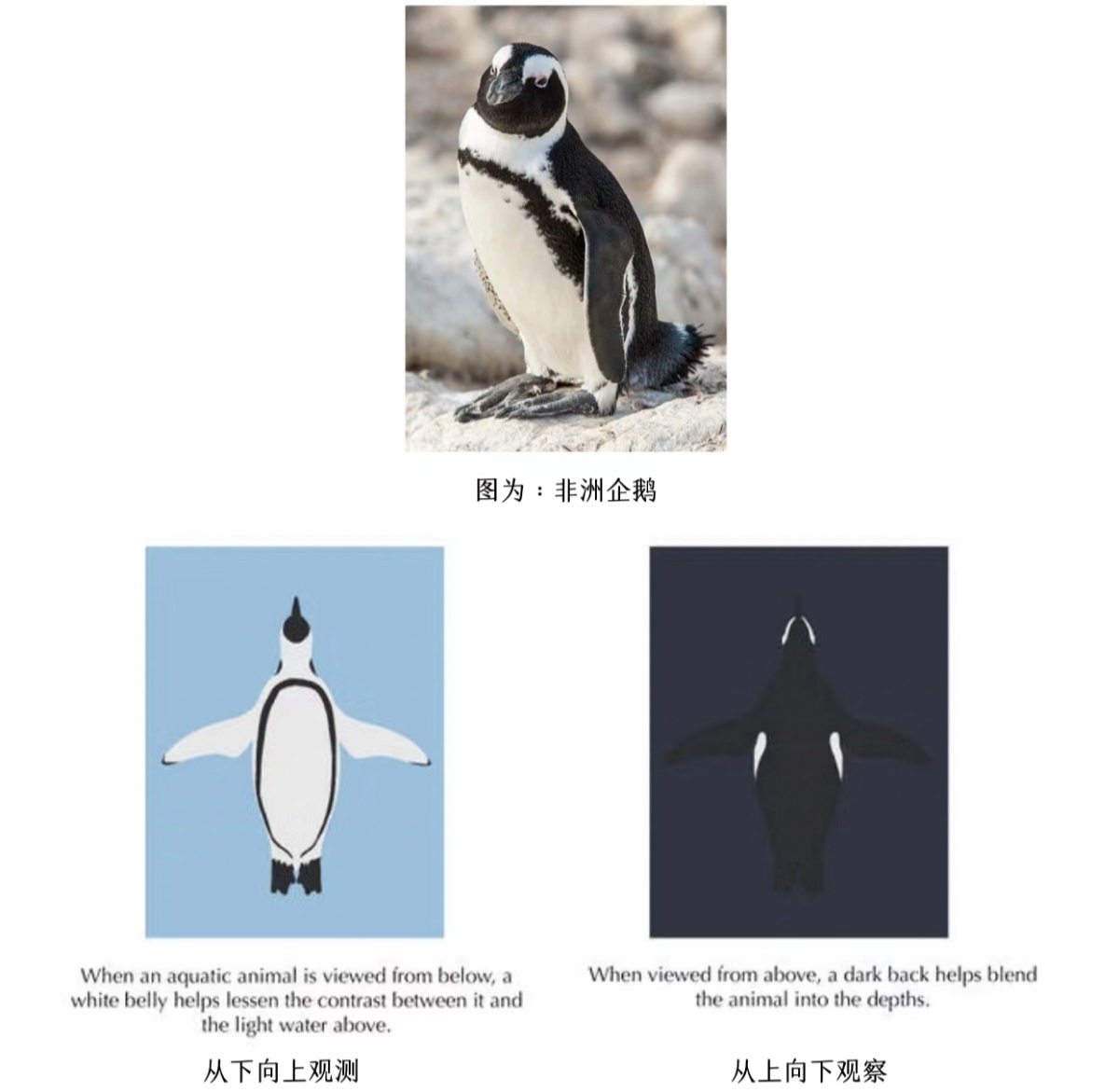 在水中和空中遨游的鱼类和鸟类的会被从各个角度看见,这一反向阴影则更多是根据视角发挥作用,如图:从下往仰视,浅色的腹部则可以使它们与明亮的海面或天空融为一体;从上方俯视,深色的背部则与深海或陆地的颜色更匹配。