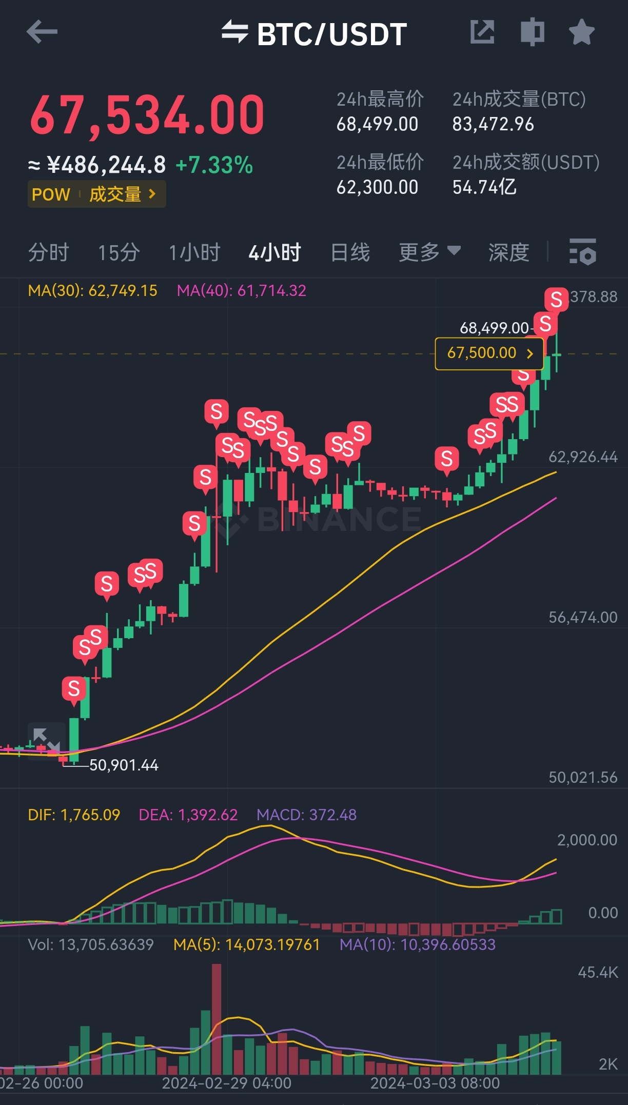 比特币已经达到68500刀,按照币安的7.36的人民币汇率,比特币已经达到50万元人民币一枚。