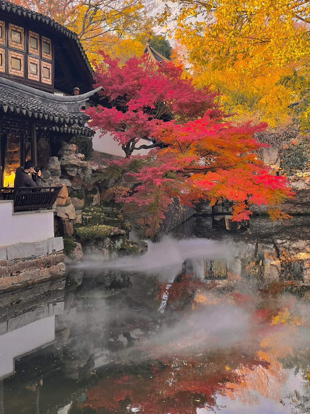 ✅拙政园:建议早上入园人较少,【见山楼】的红枫美到炸裂,谁拍谁好看,池面上还有仙气缭绕(p1,p2,p9)
