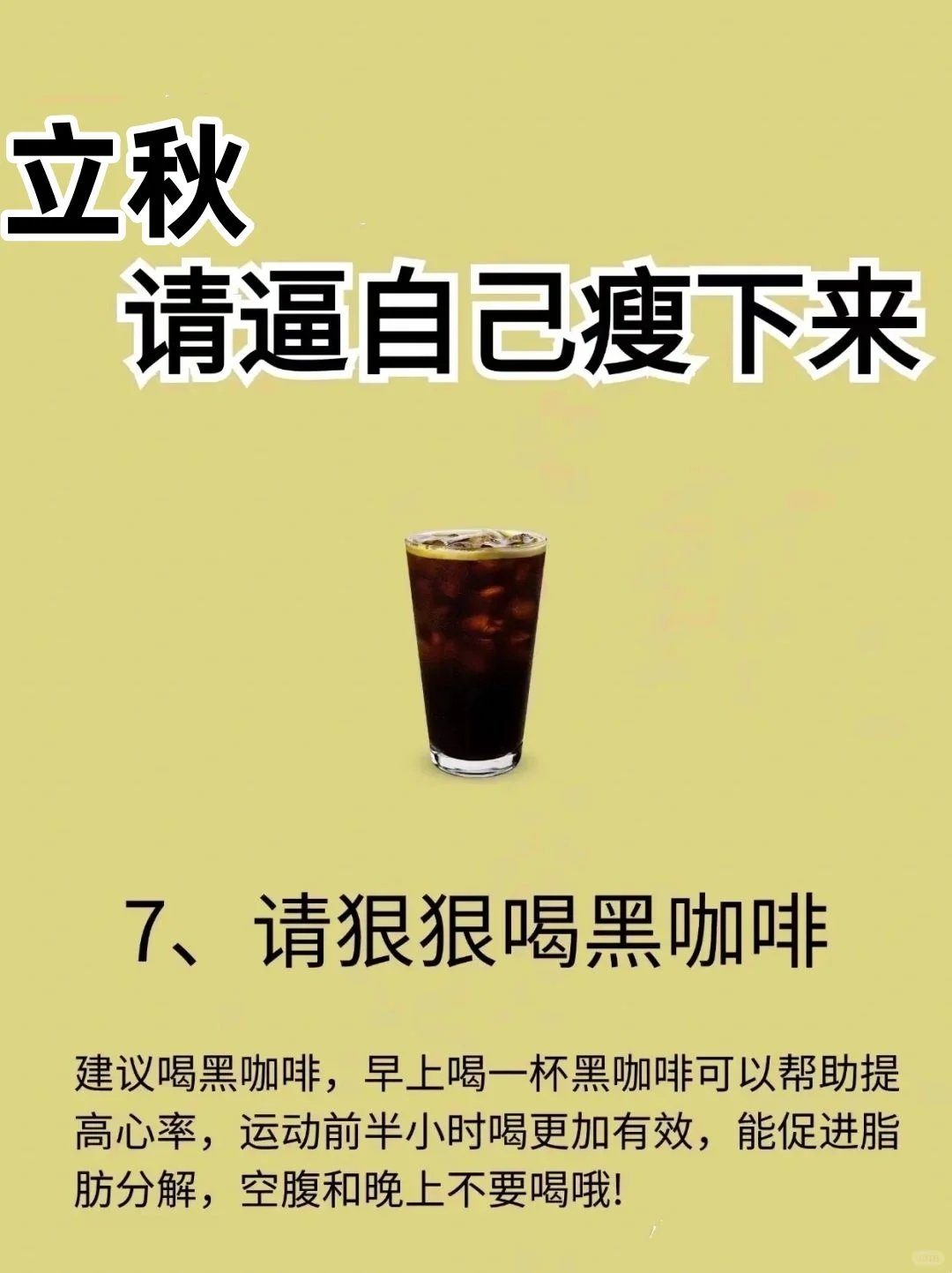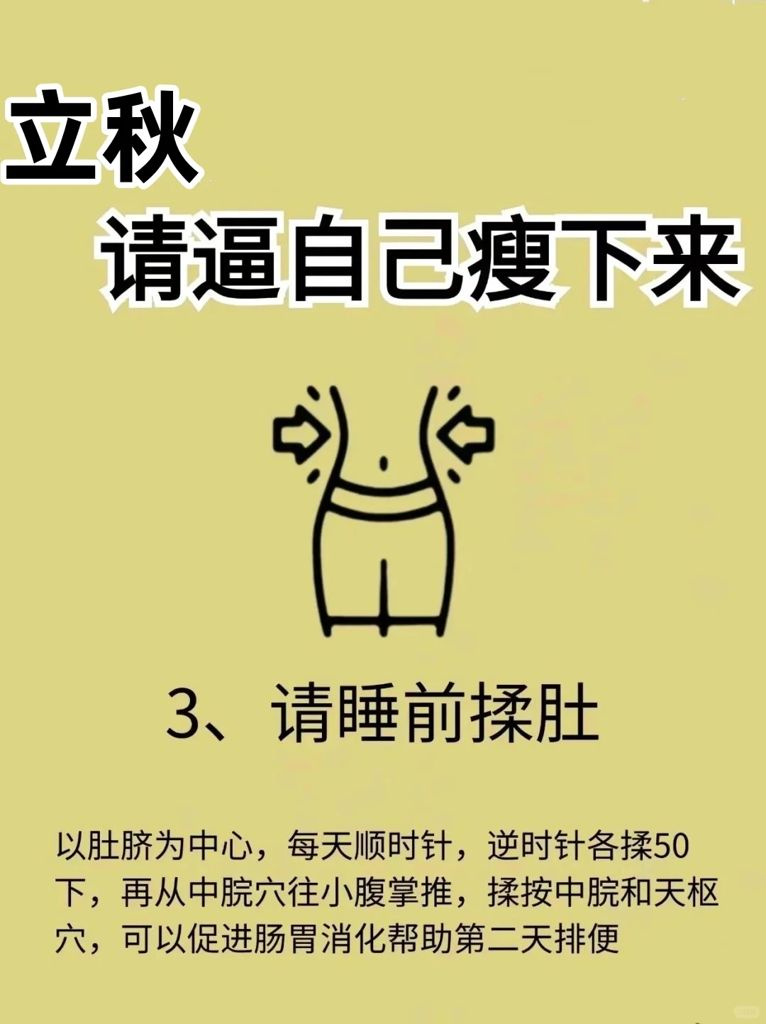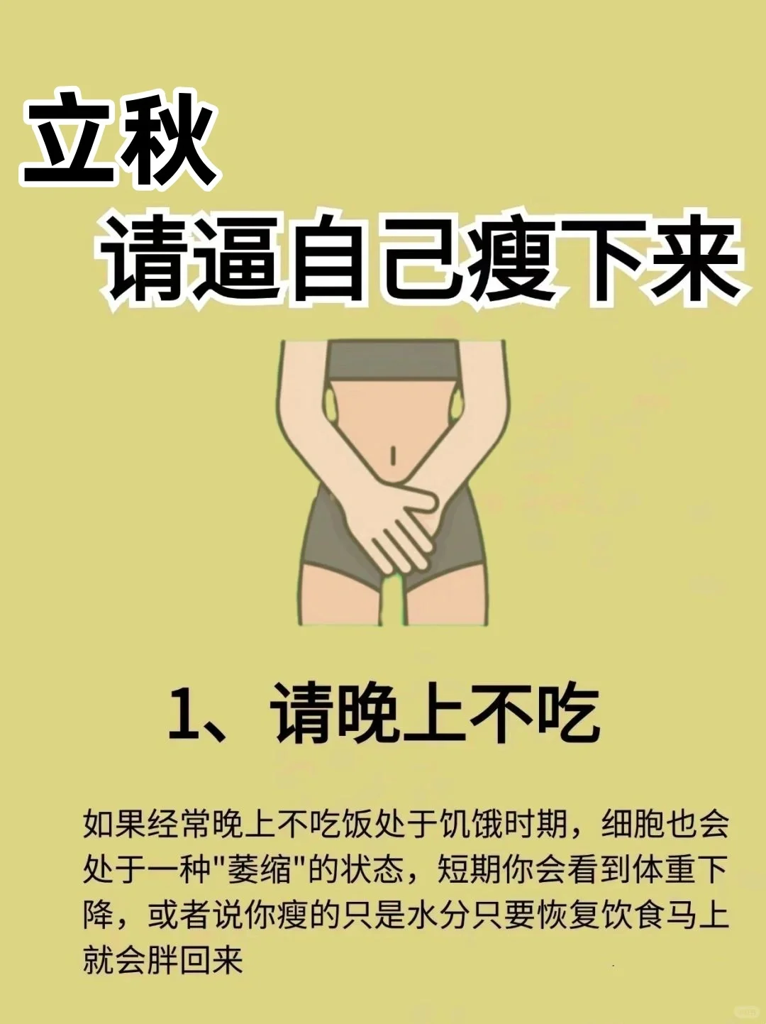 坚持每天喝2000ml温水只吃早饭和午饭,晚饭不吃不用运动,在这期间体脂会下降很快,体重下降幅度最大开始的前三天身体会感到很饥饿,三天之后可以逐渐适应第二周是关键时期,曙光就在眼前!这一周开始燃烧脂肪,坚持下去(可👇4-6斤)