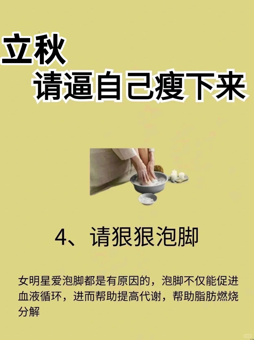 饮食跟第三周一样,偶尔可以放纵脂肪大量减少,胃小了很多男生对摄入蛋白质进行肌肉锻炼女生可以练瑜伽,哑铃,进行su形睡前可用热水泡脚,提高新陈代谢能够坚持一个月,恭喜你已经成功啦!能够坚持一个月,恭喜你成功了(可👇3-6斤)