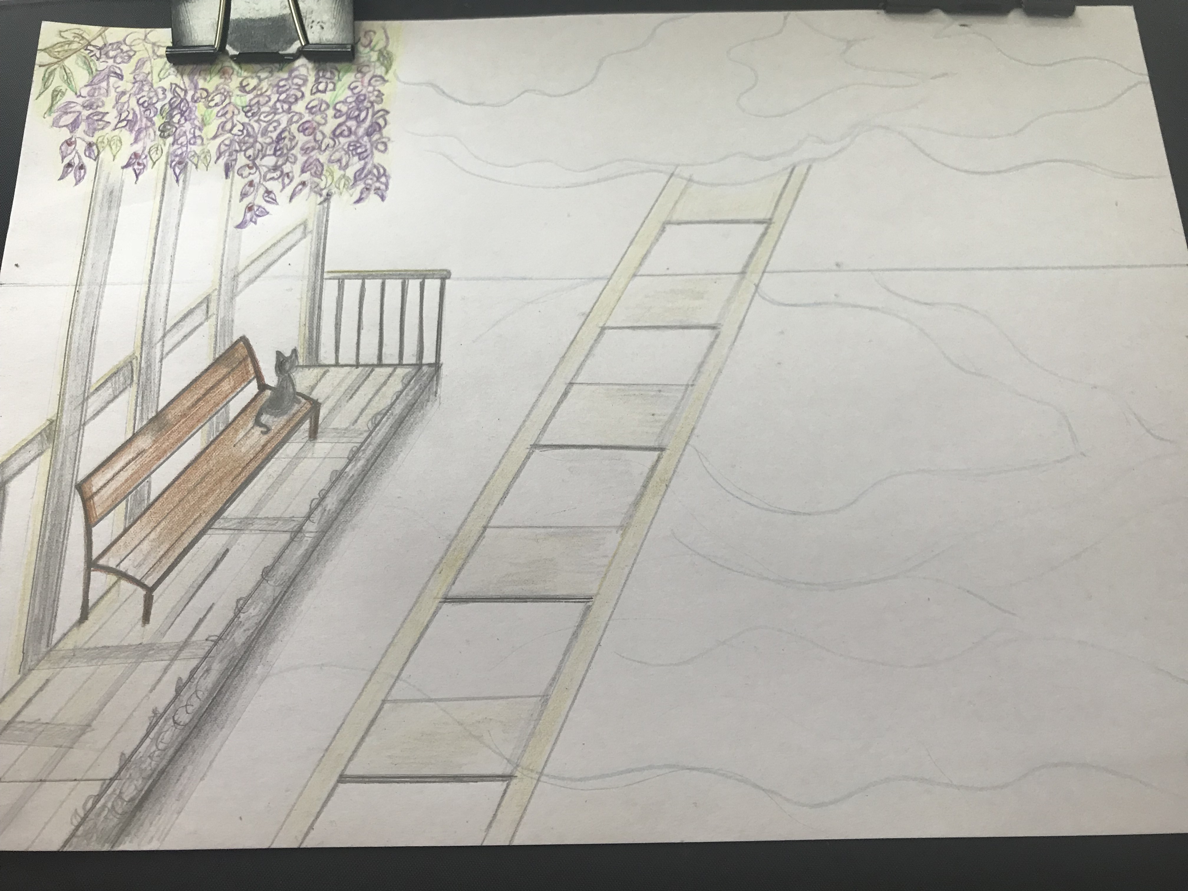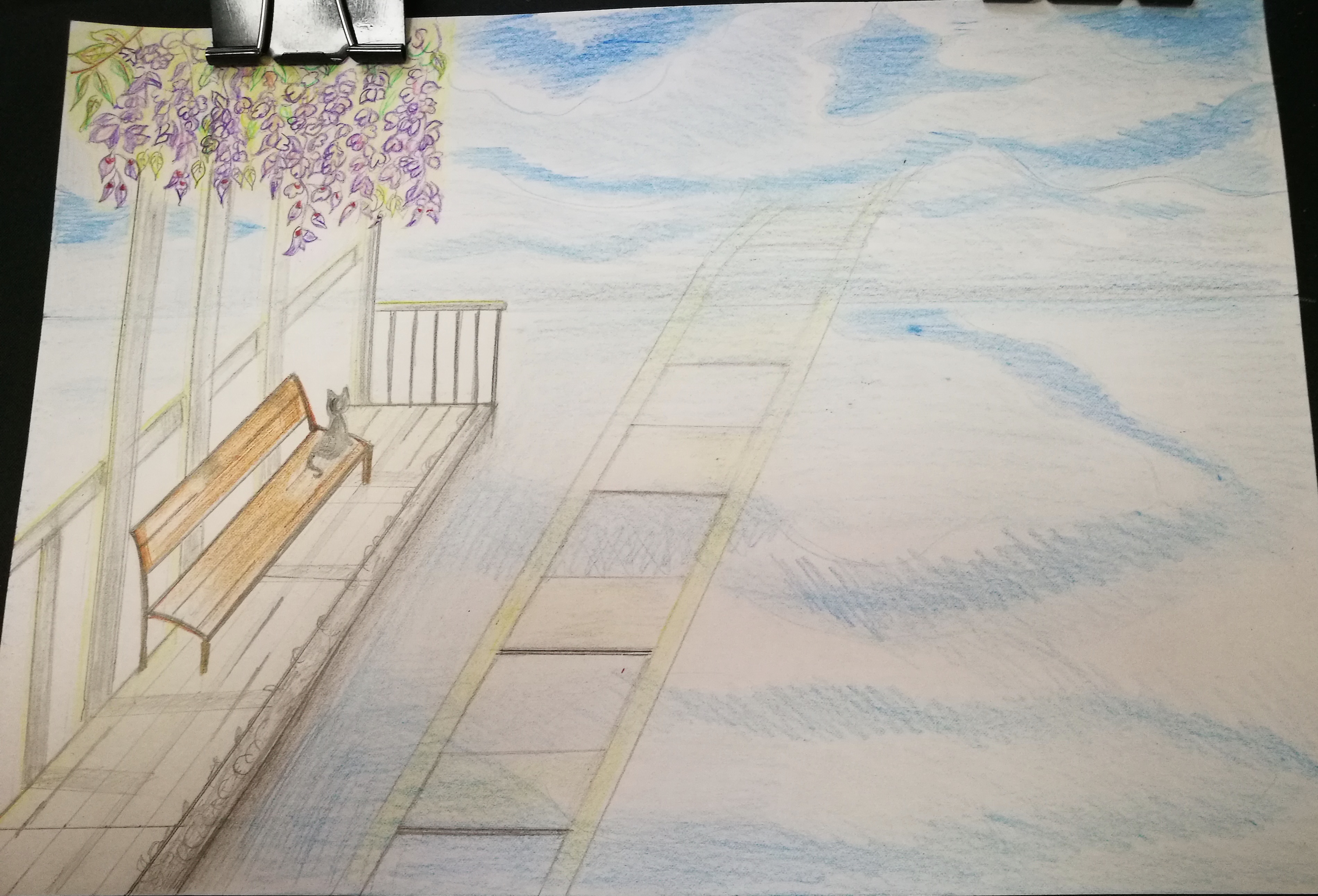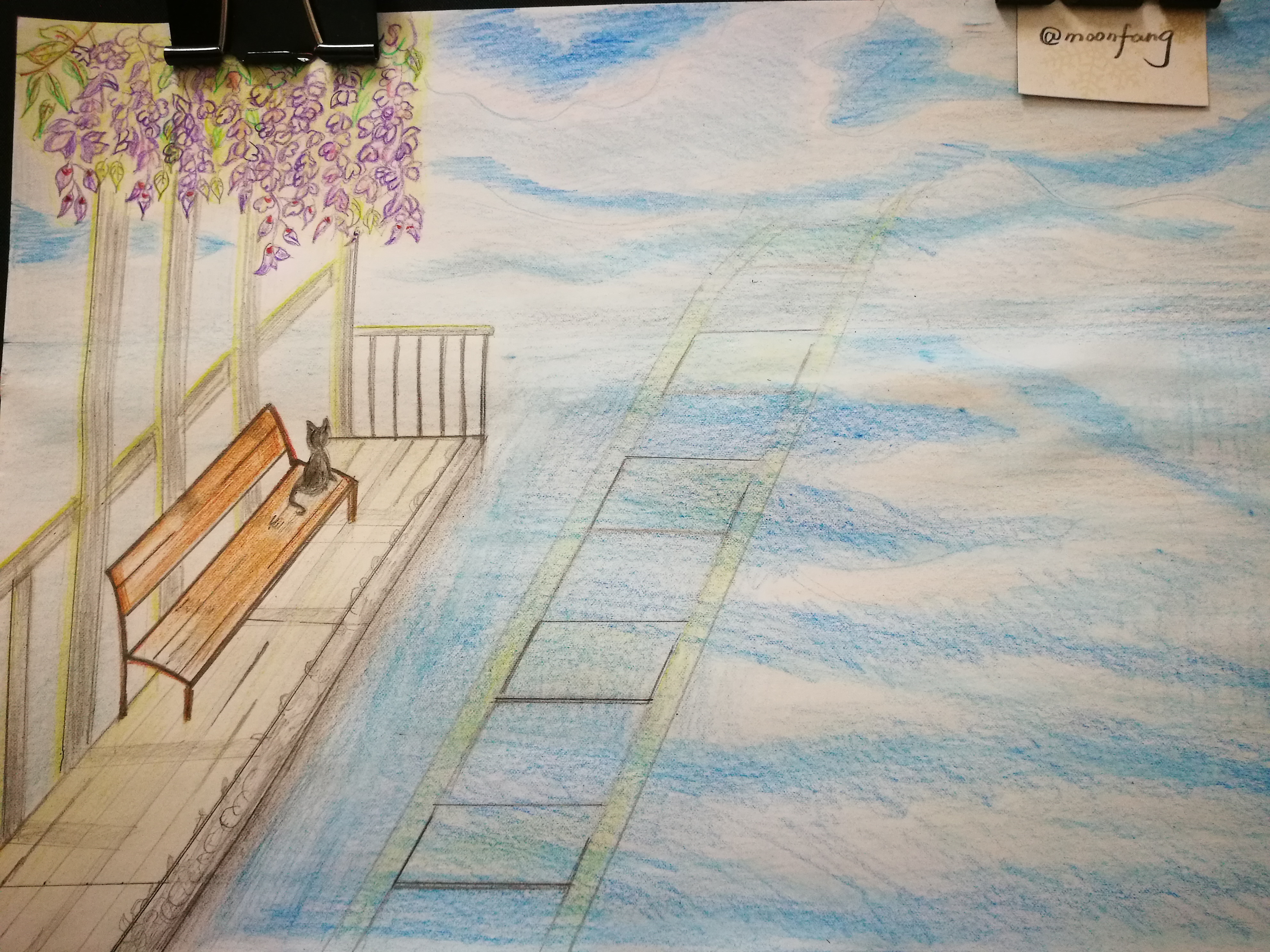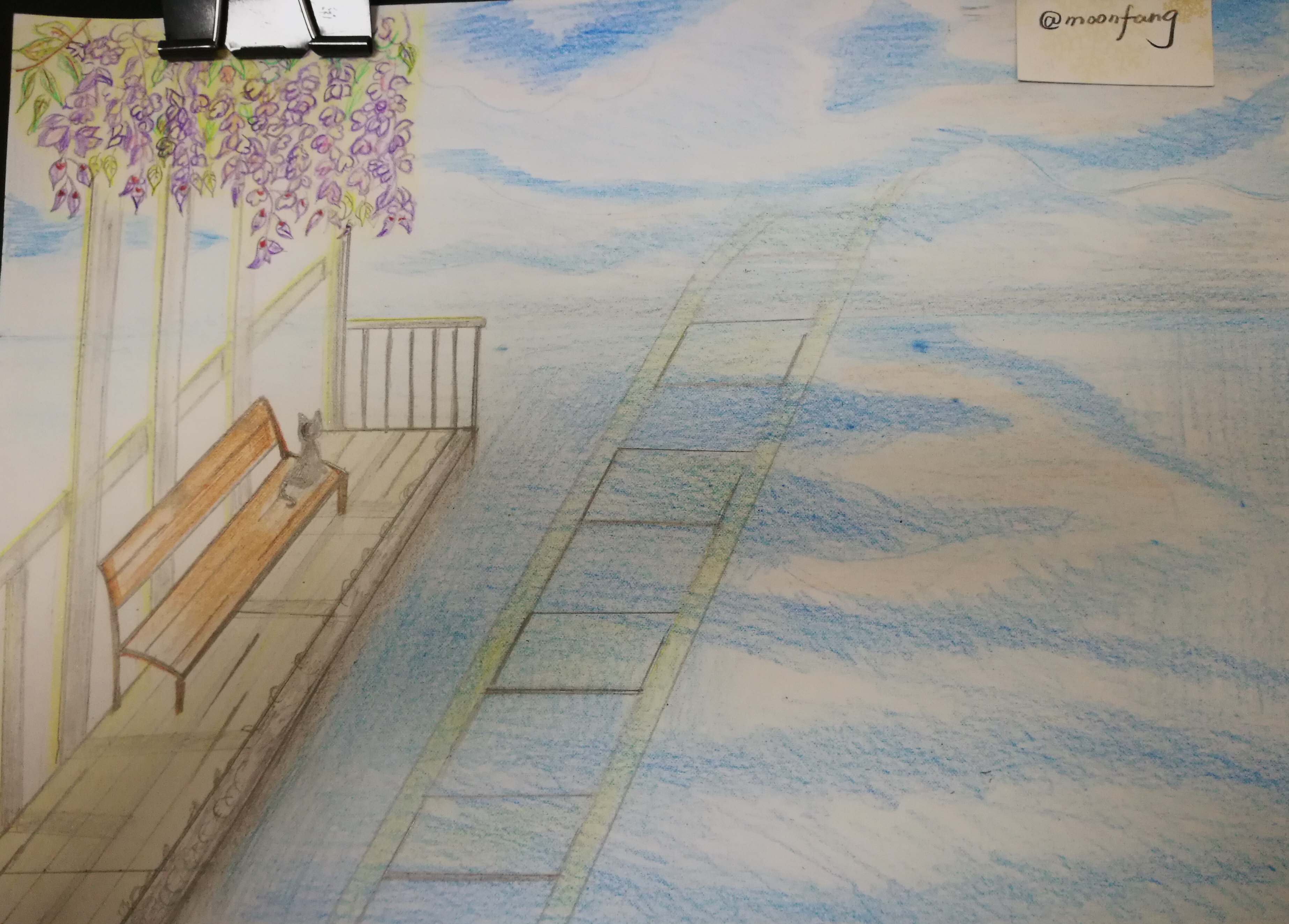 ✲ 画出天空的云朵,以及海中的倒影。修改了轨道的方向。因为我是想表达轨道延伸到很远的地方消失在海天的尽头,所以直线的表达不够准确,没有蜿蜒之感。