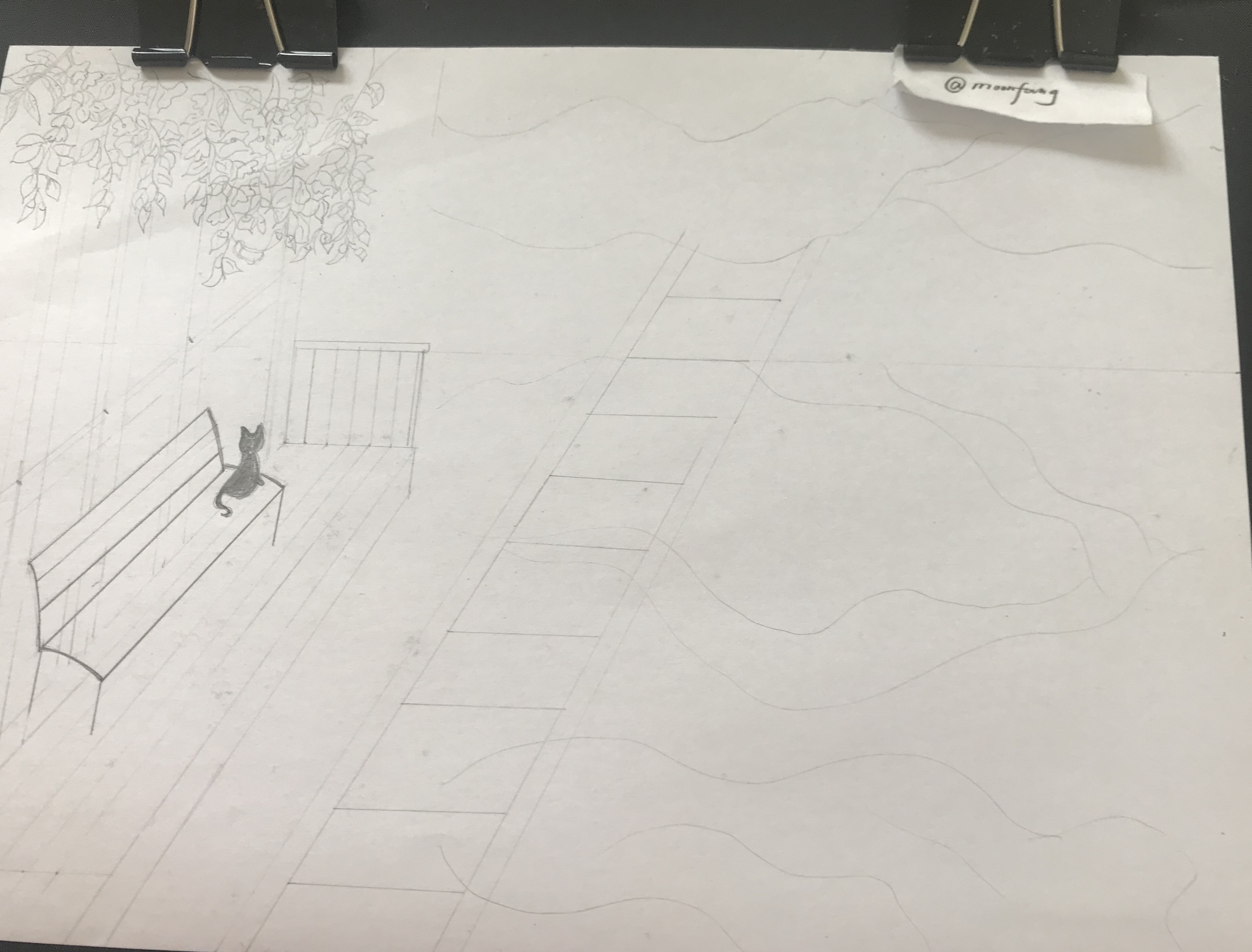 ✲ 画出主要场景 车站 长椅 小喵 海中的轨道 天上的云 云在海中的倒影。