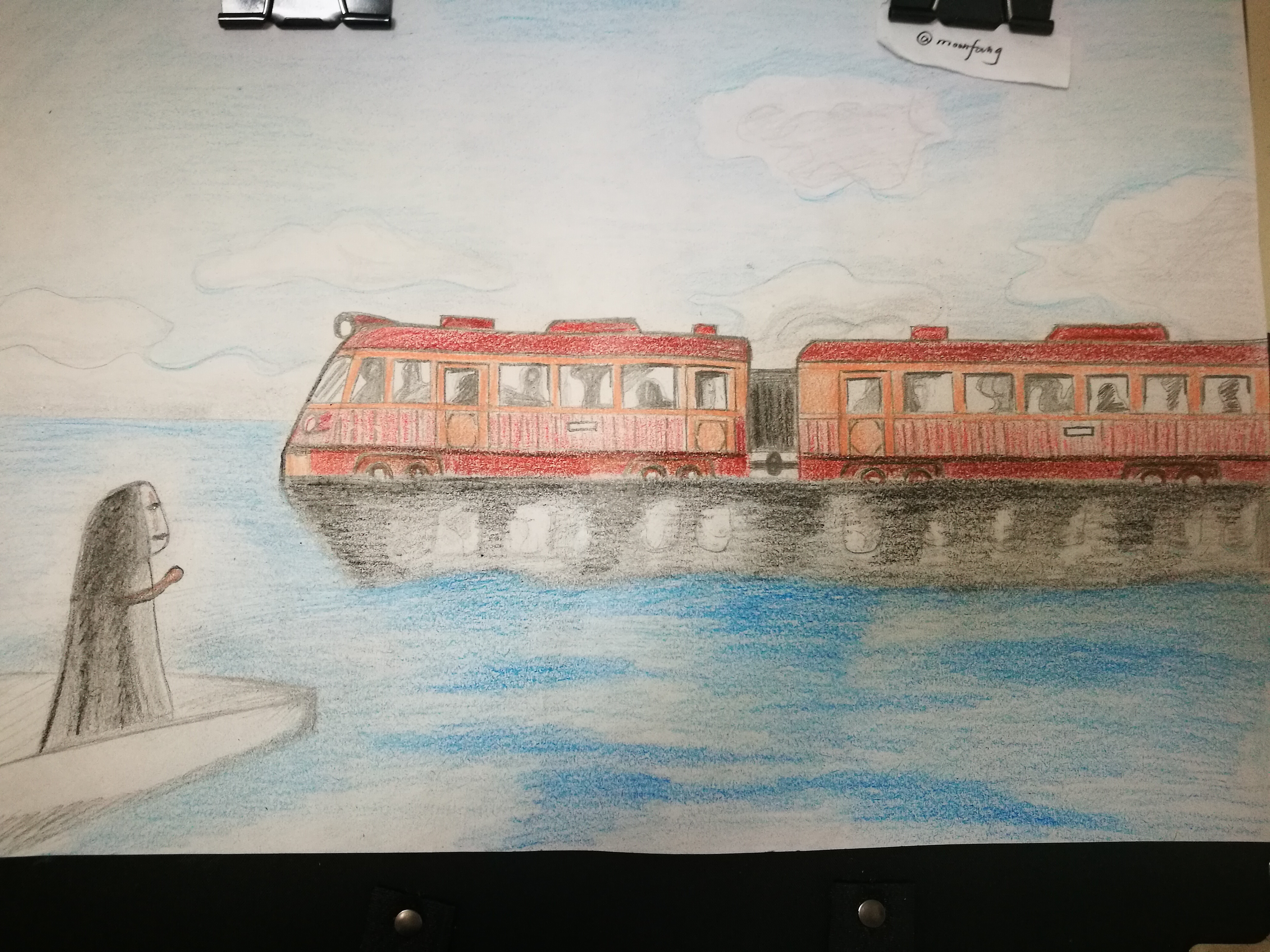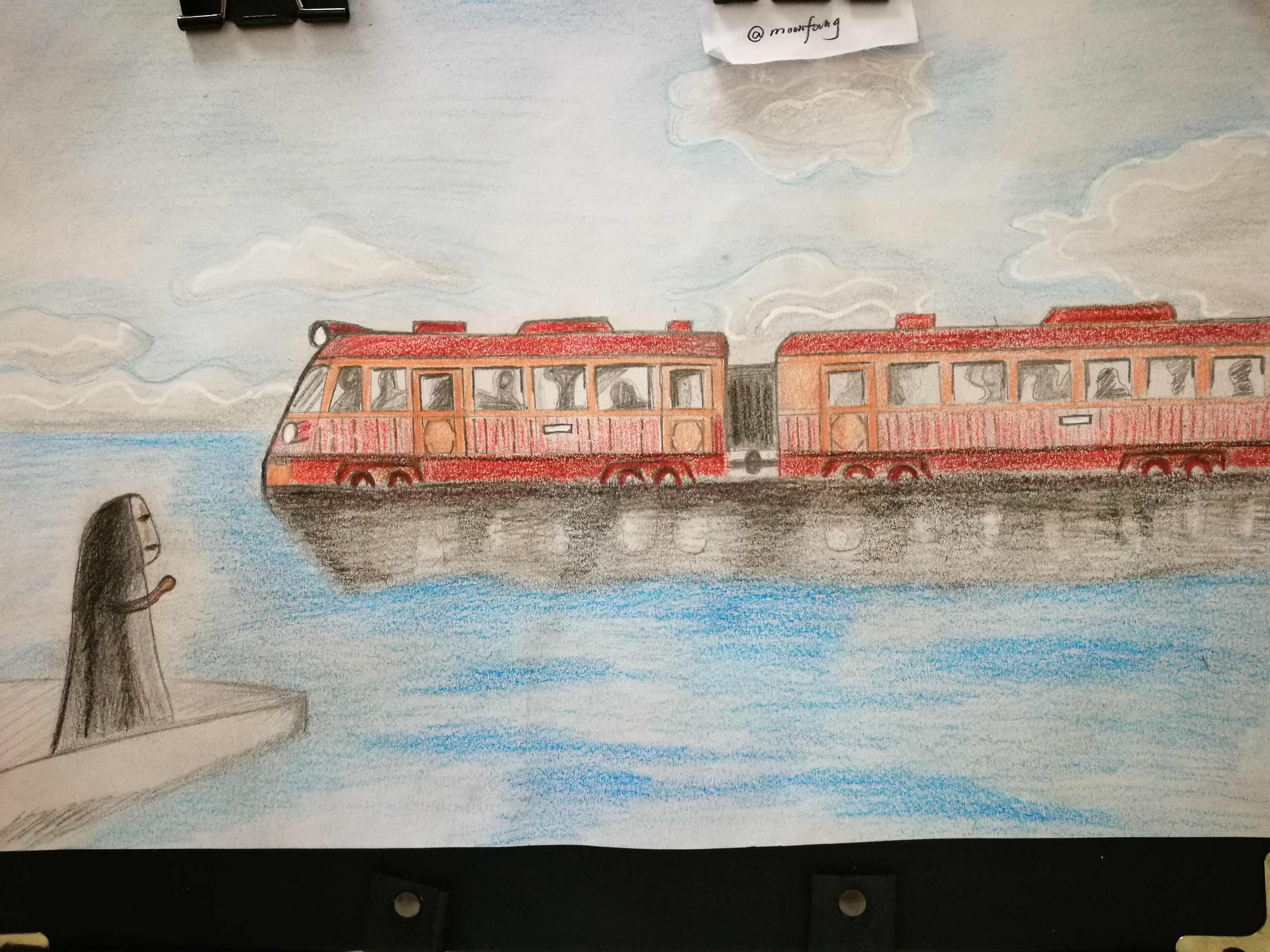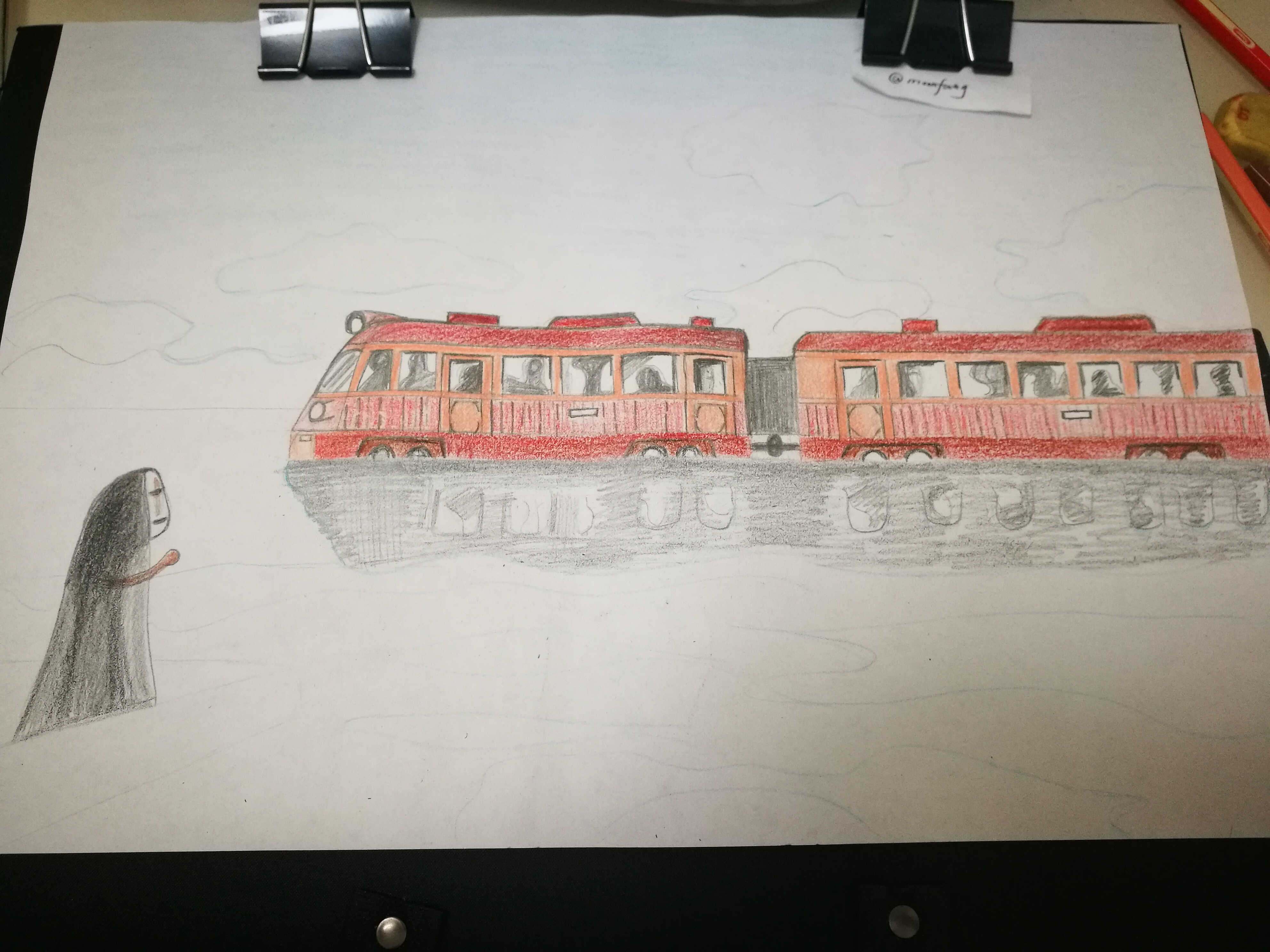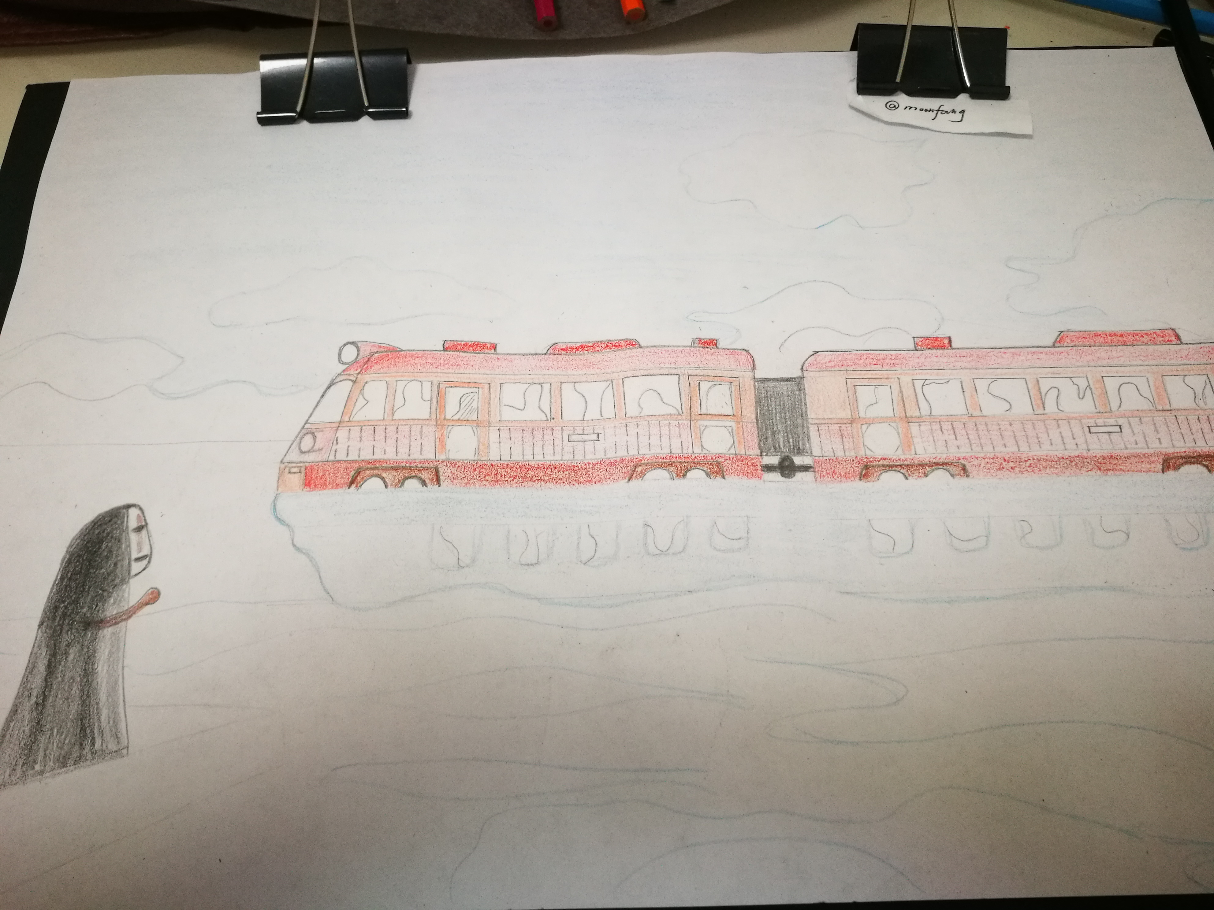 海中的车站&千与千寻moonfang (38)in #cn-drawing • 8 years ago 喜欢宫崎骏老爷子的动漫,我也来画一幅——千与千寻中海中的电车。 Drawing steps ✲先构图 画出电车和它水中的倒影、天上的云、 等车的无脸男 。倒影很浅,云朵的边缘也画得很浅。 ✲浅浅地上一层颜色,用蓝色铅笔勾勒出海面深色的区域。 ✲加深颜色,画出电车水中的倒影,记得留出车窗玻璃在水中的光亮。 ✲画出海面的层次,以及天空的浅蓝色背景突出云朵的轮廓。 ✲加强高光部分,完善细节。云朵画得不好,还需继续努力。 #cn-reader #drawing #art